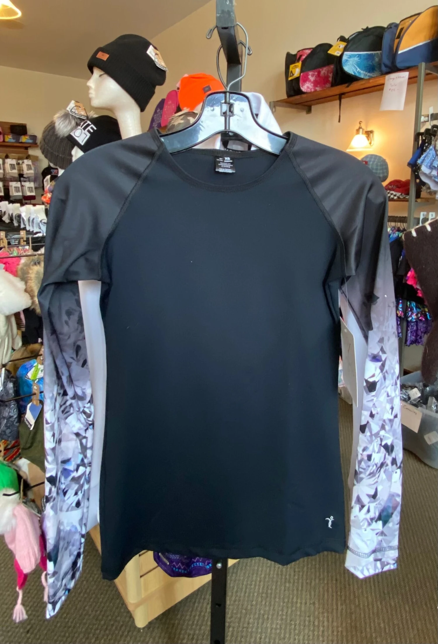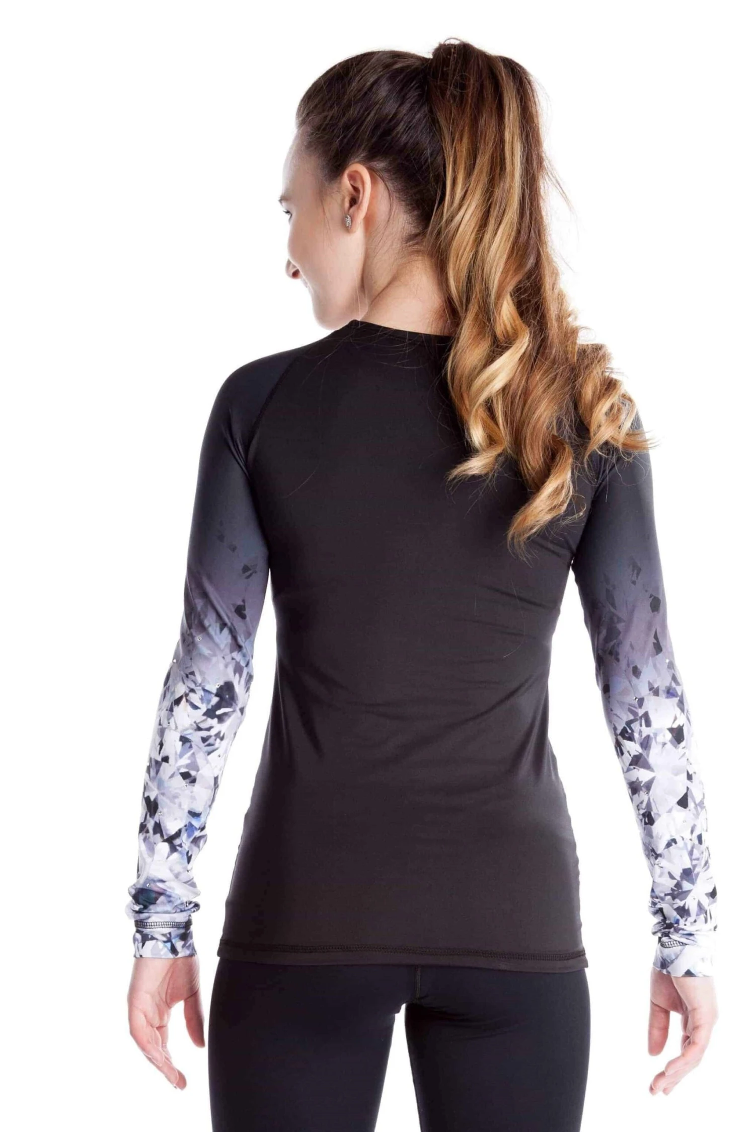 Black figure skating training shirt with sublimated black crystal long sleeves. Fitted style, longer cut. Scoop neck.Â