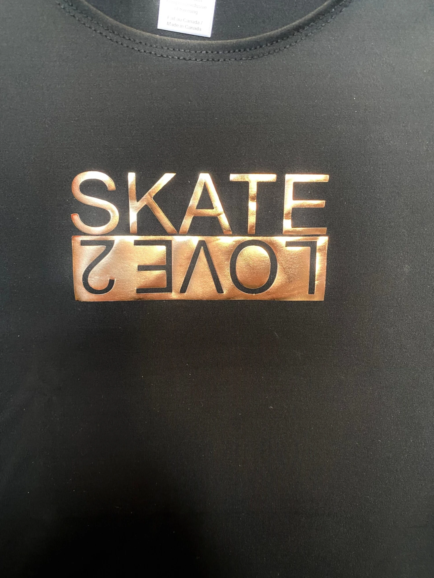Black figure skating training shirt with rose gold print on front. Fitted style, longer cut. Scoop neck.Â