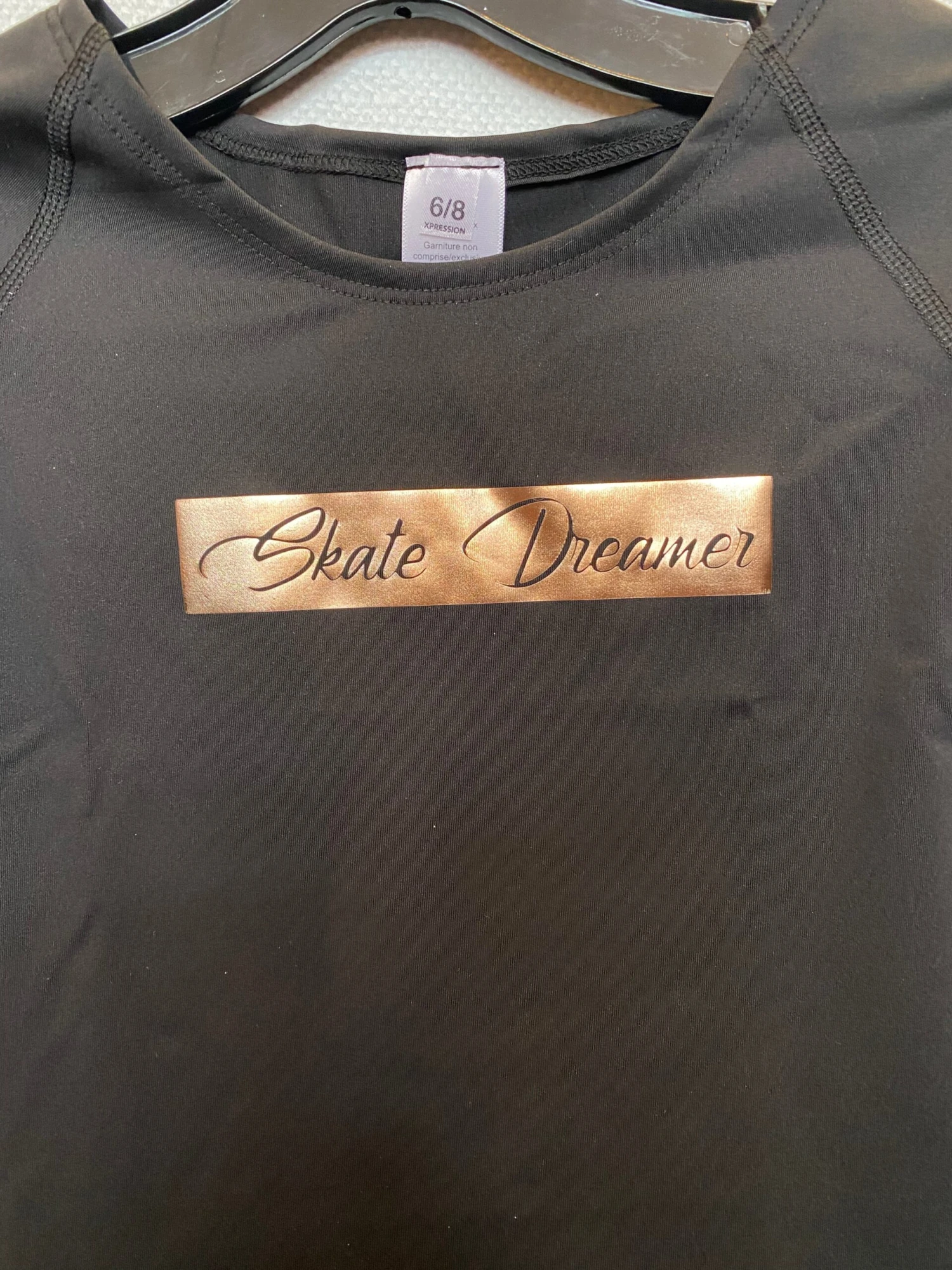 Black figure skating training shirt with rose gold print on front. Fitted style, longer cut. Scoop neck.