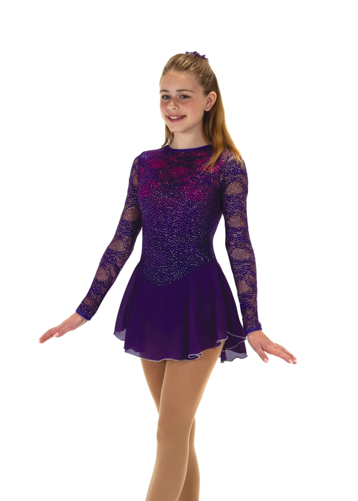Deep purple glitter lace over color grade lycra. This skating dress has an underlayer that grades from pink to purple. Long lace sleeves, matching georgette skirt edged in silver.Â