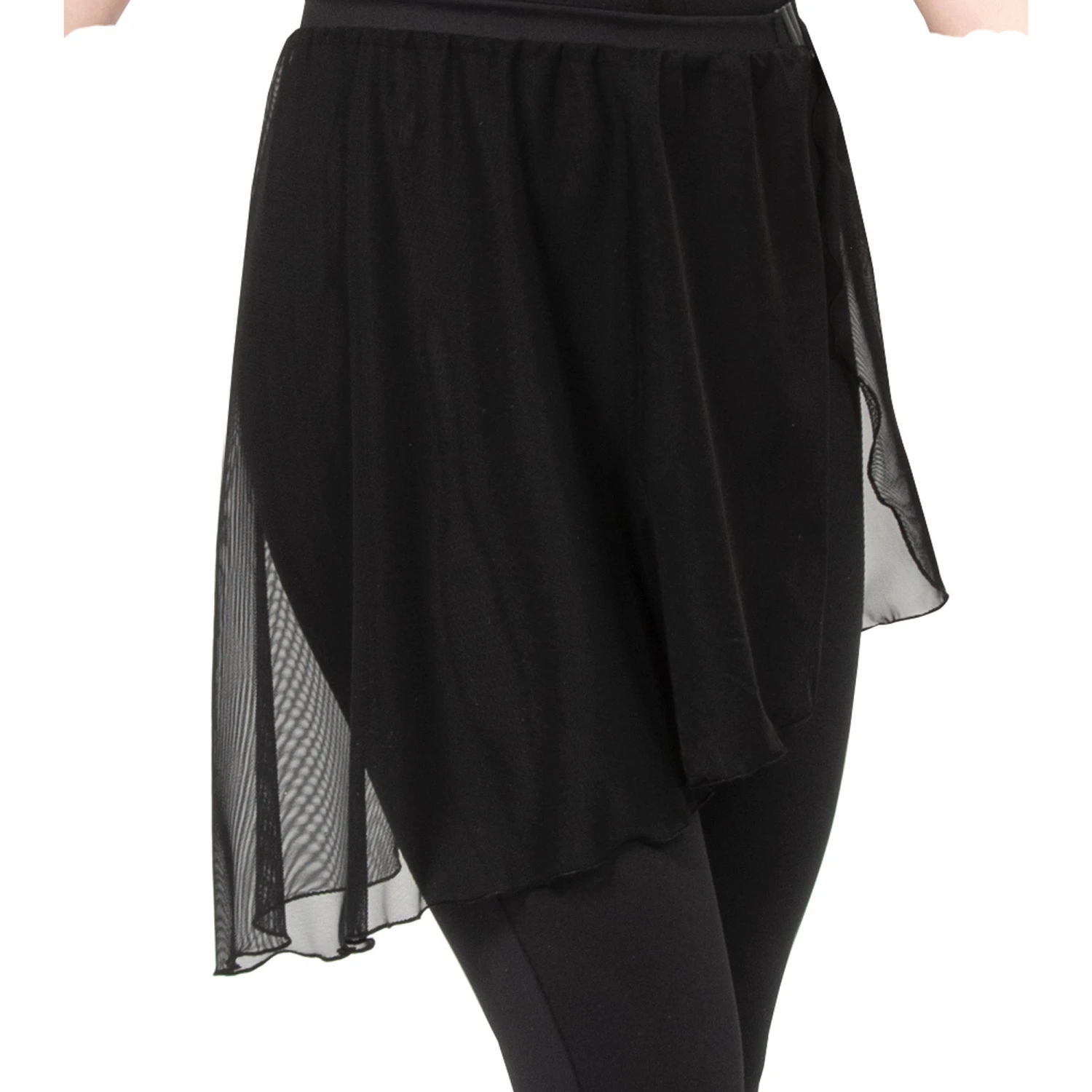 A sheer black mesh skirt. Perfect for wearing with a bodysuit, 1-piece or leggings. This style features a lycra band with a clip closure and angled hem.