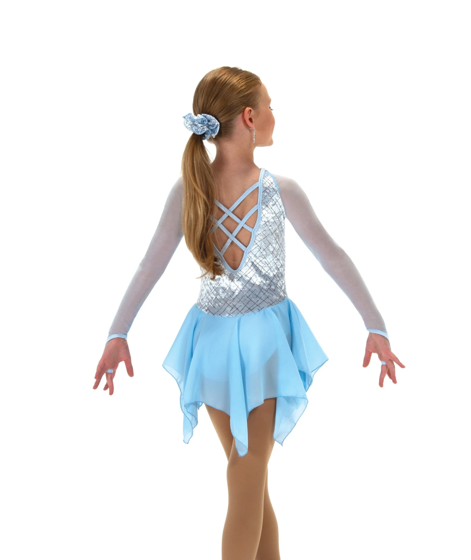 Icy blue crushed glitter velvet skating dress, princess styling, long mesh sleeves with finger points, handkerchief georgette skirt, open strappy back. Lined.