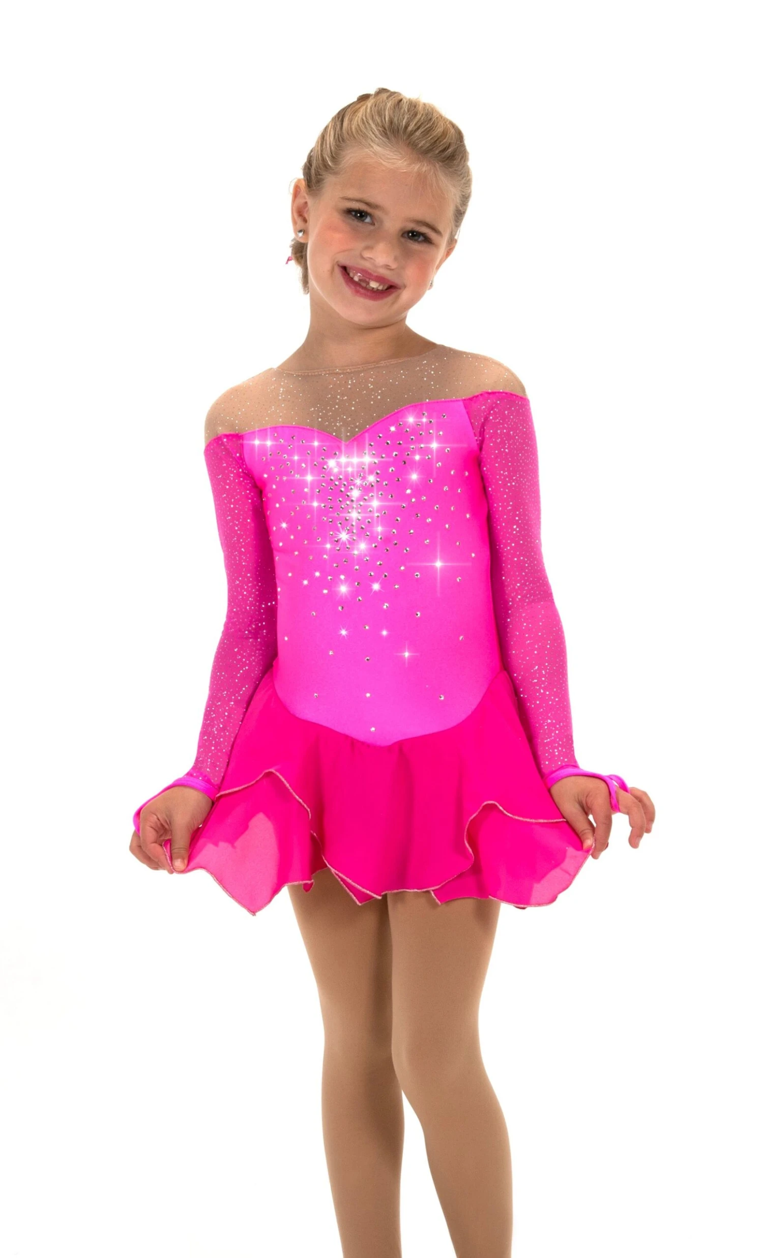 Sparkling glitter mesh skating dress, glitter mesh sleeves with finger points, generous splash of crystals front and back, off the shoulder styling, tulip hem skirt. Lined.
