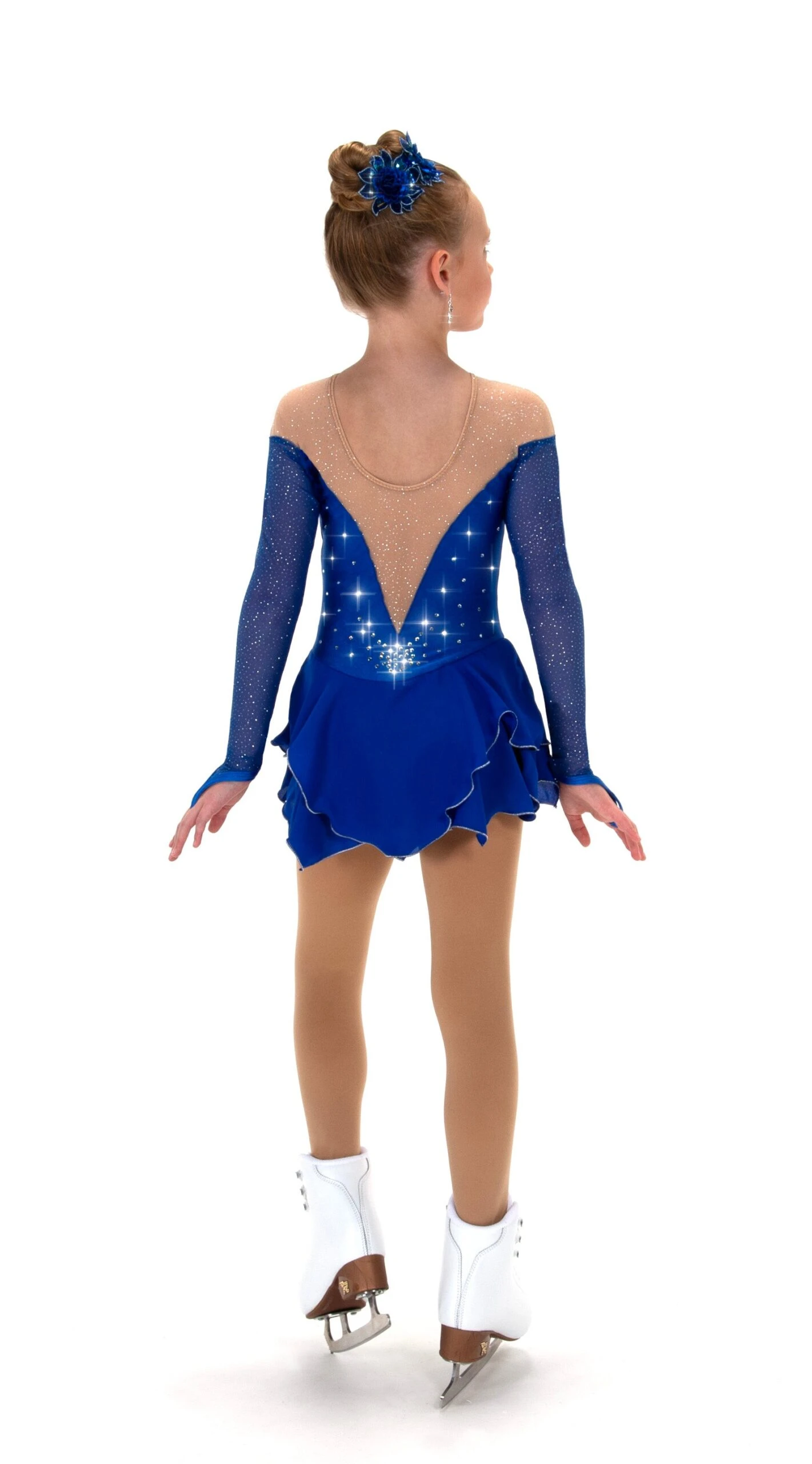 Sparkling glitter mesh skating dress, glitter mesh sleeves with finger points, generous splash of crystals front and back, off the shoulder styling, tulip hem skirt. Lined.