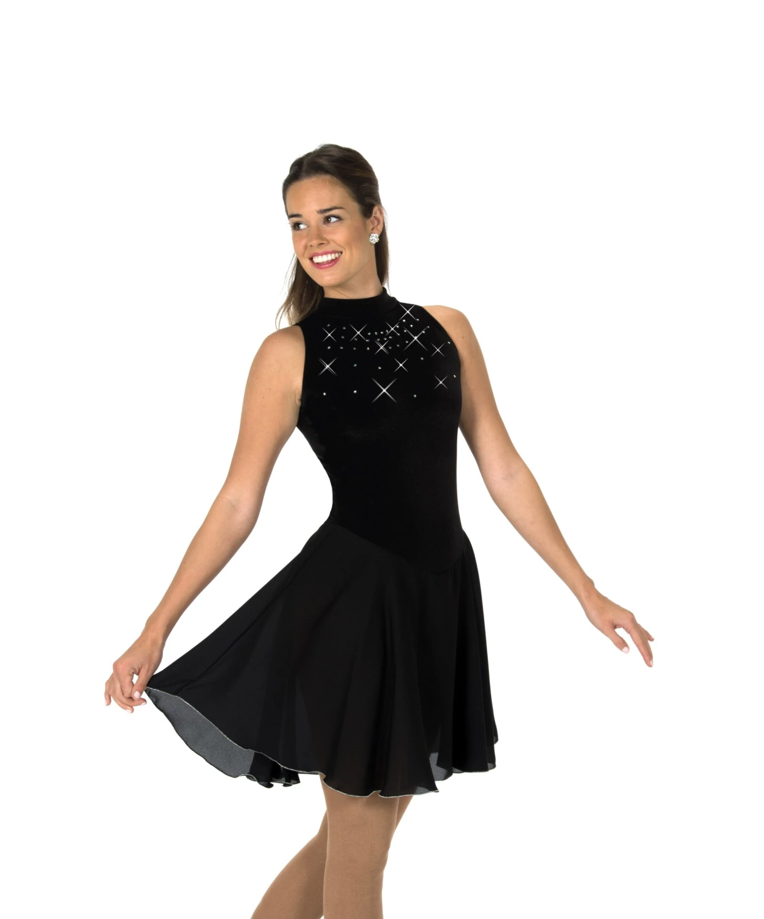Black velvet ice dance skating dress. Dance length with a high neck accented by sparkling crystals and a traditional back keyhole. Matching single layer georgette dance length skirt edged in silver.