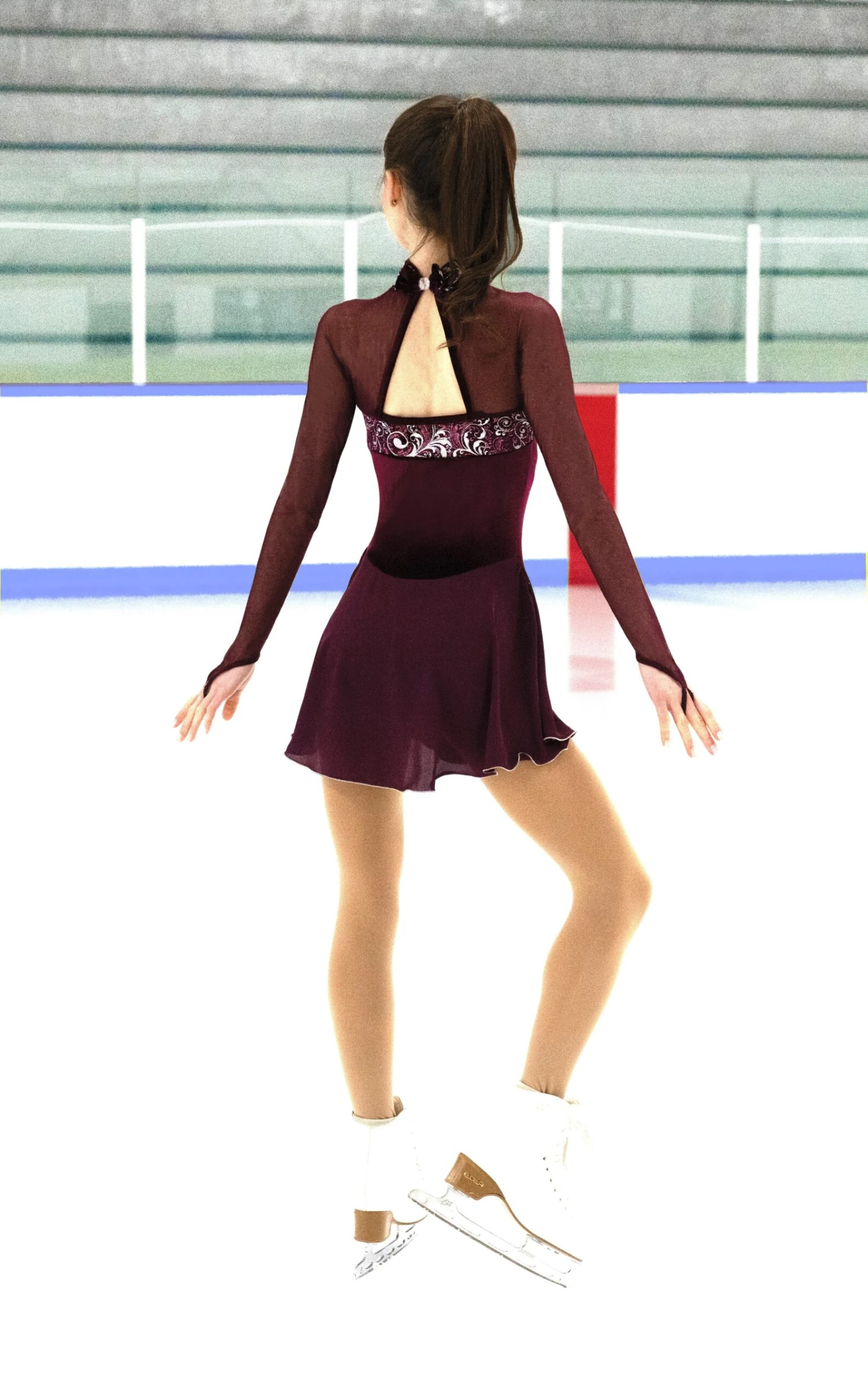This velvet skating dress has an asymmetric front design and high neck. Trimmed with silver and gold glitter velvet, accented by a fan of sparkling crystals. Long mesh sleeves with finger points, a back clip and a slanted overlapping georgette skirt.