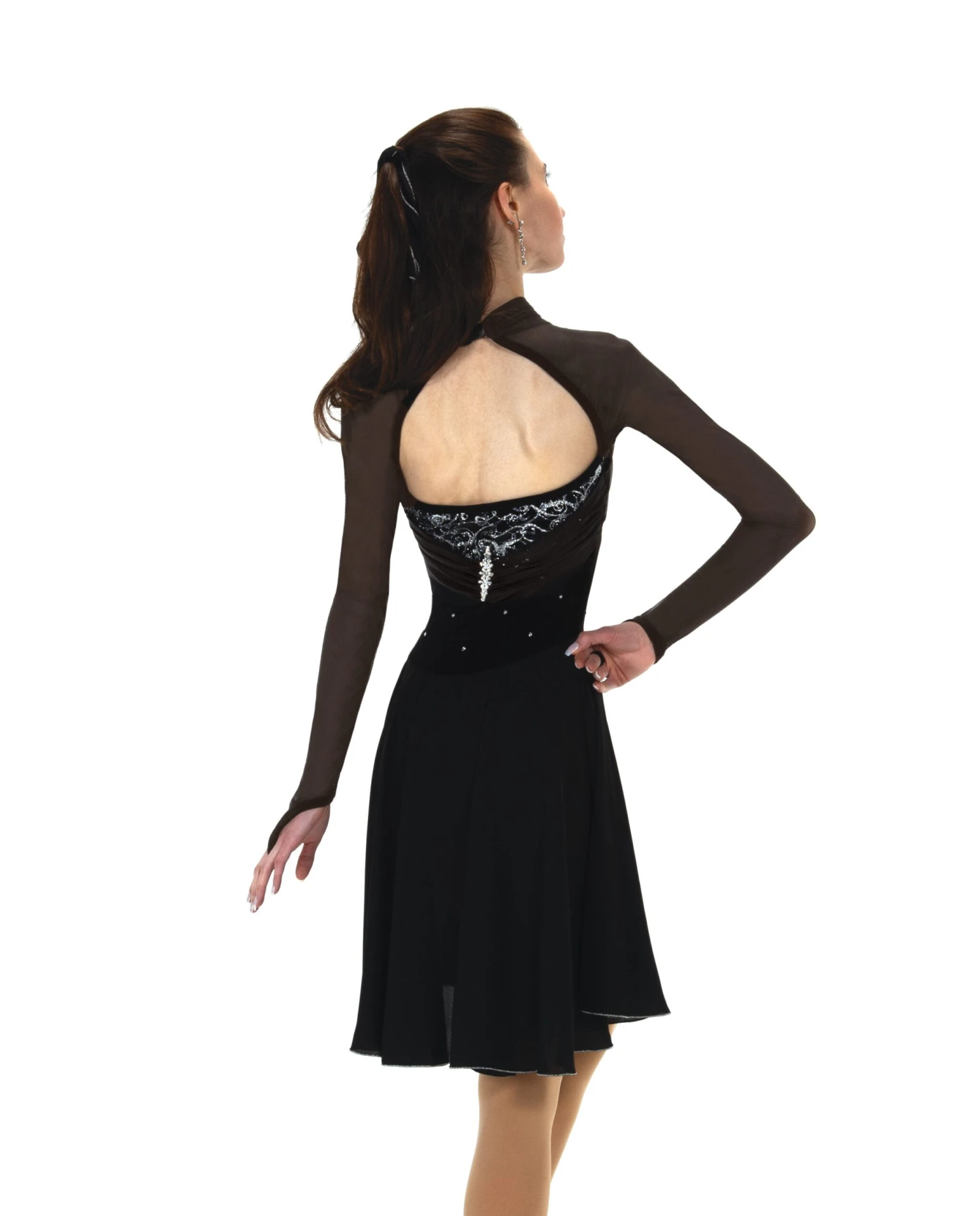 Black velvet ice dance skating dress, studded with crystals. Long dance length georgette skirt, gathered mesh wraps around the neckline, long mesh sleeves with finger points.Â