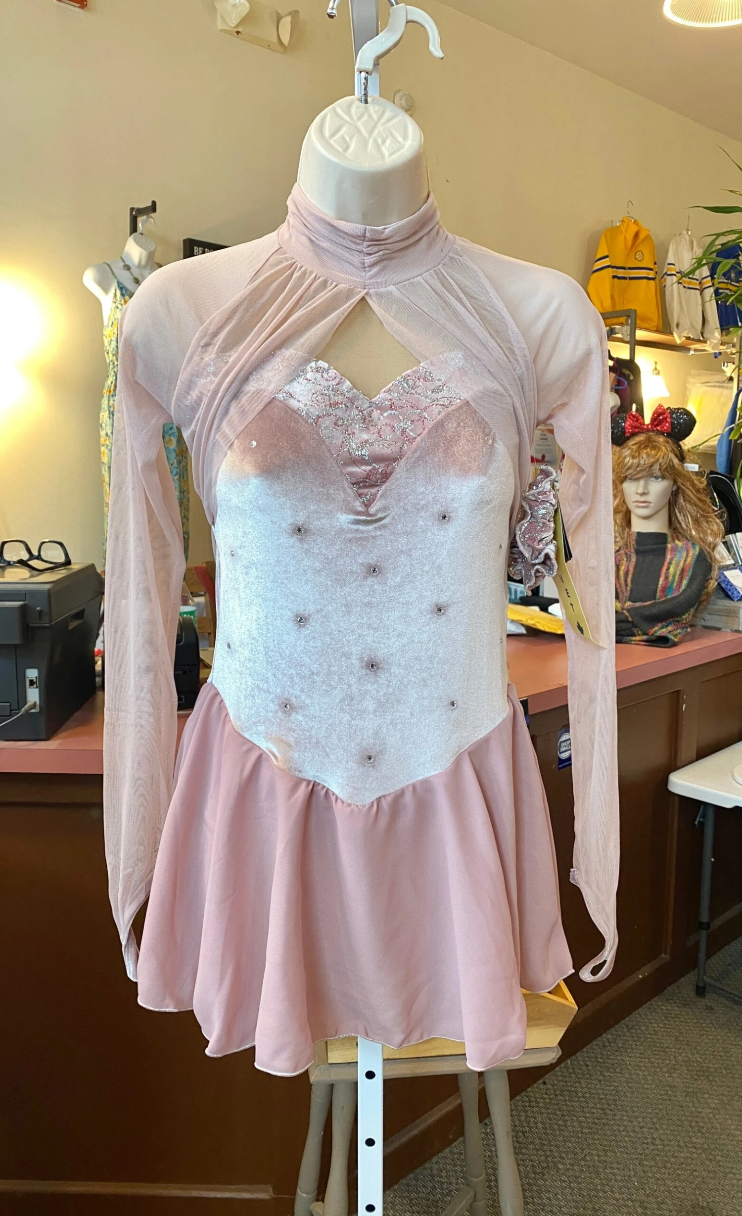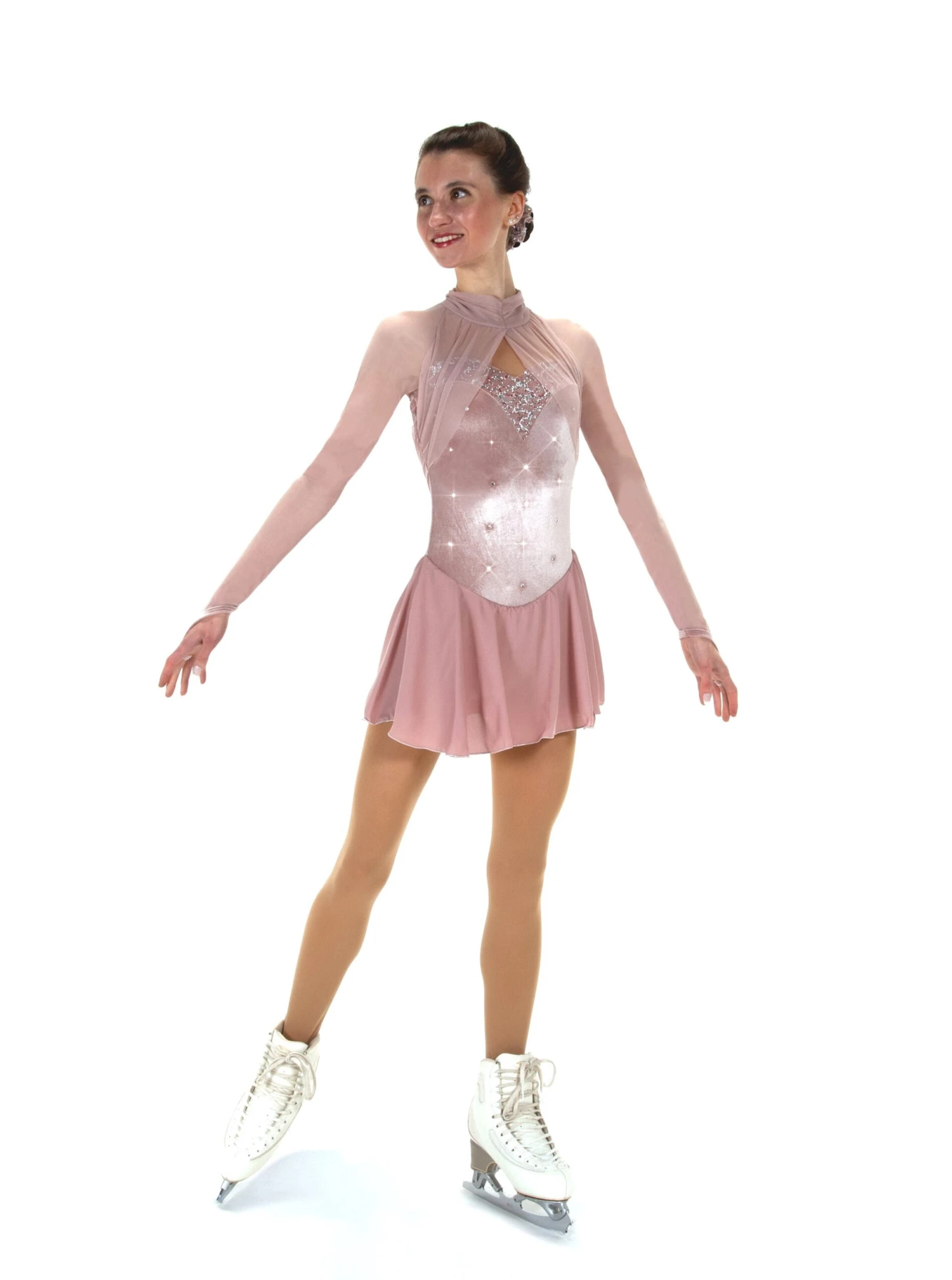 Neutral pink velvet skating dress with long mesh sleeves, georgette skirt edged in silver, gathered mesh neckline, scattered crystals.Â
