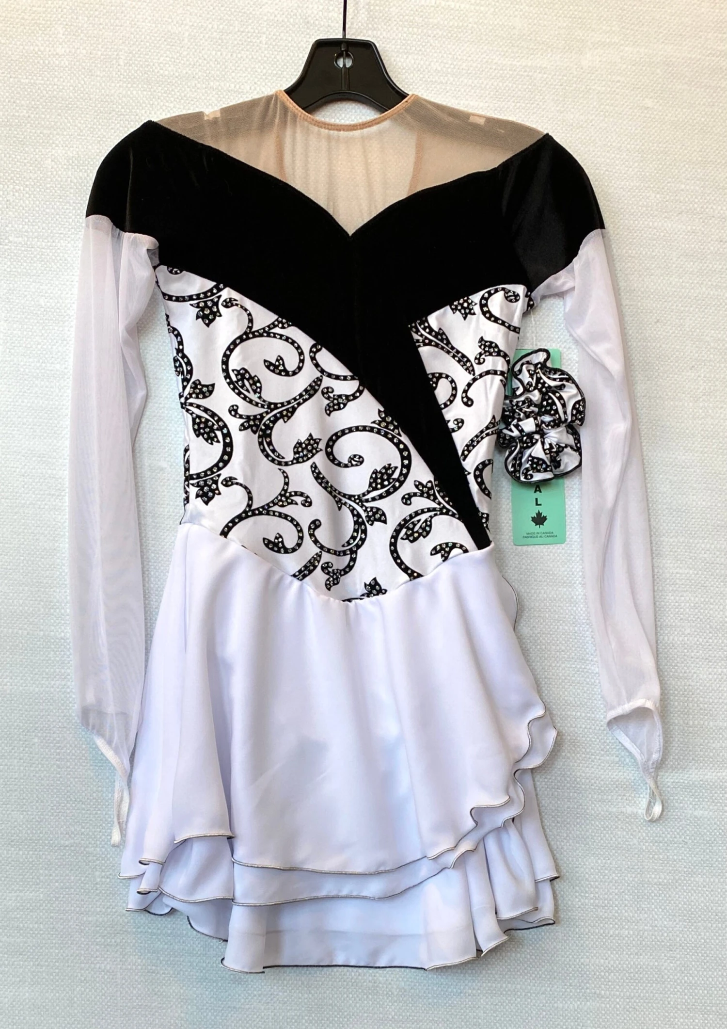 Lycra skating dress swirled with velvety flocking that is studded with silver glitter. Elegantly wrapped with wide velvet trim. Long mesh sleeves with finger points. Split wrap georgette skirt. Lined bodice.Â