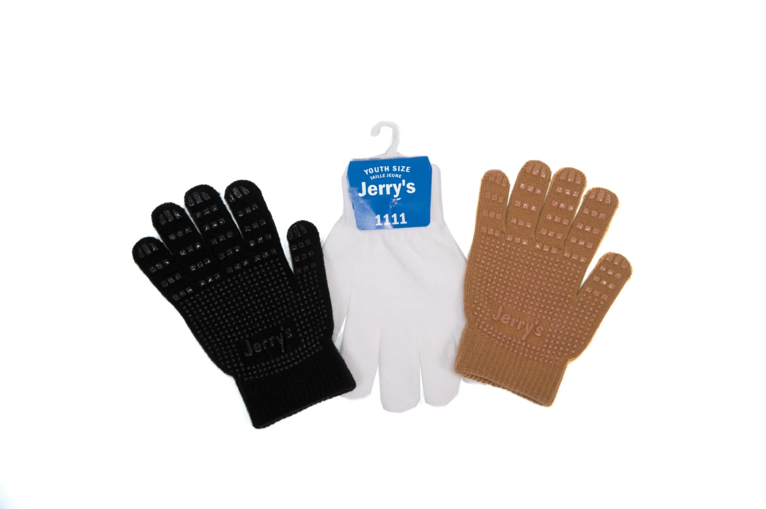 Stretch knit gloves with grippy palms and fingertips. Form fitting stretchy gloves that are perfect for cold arenas and figure skaters.