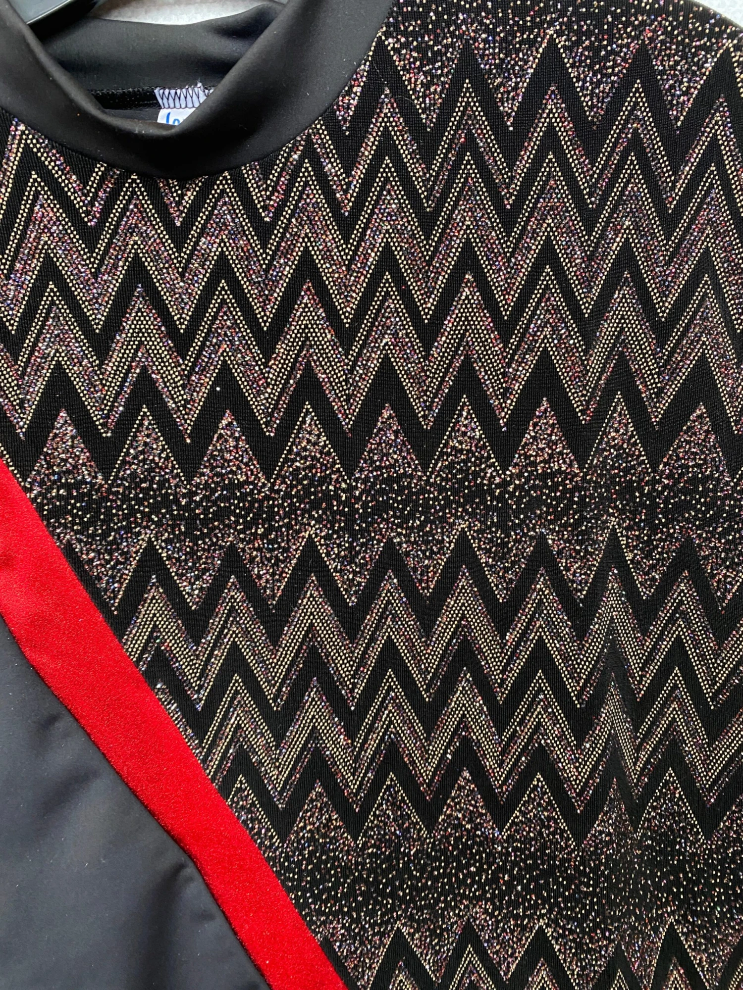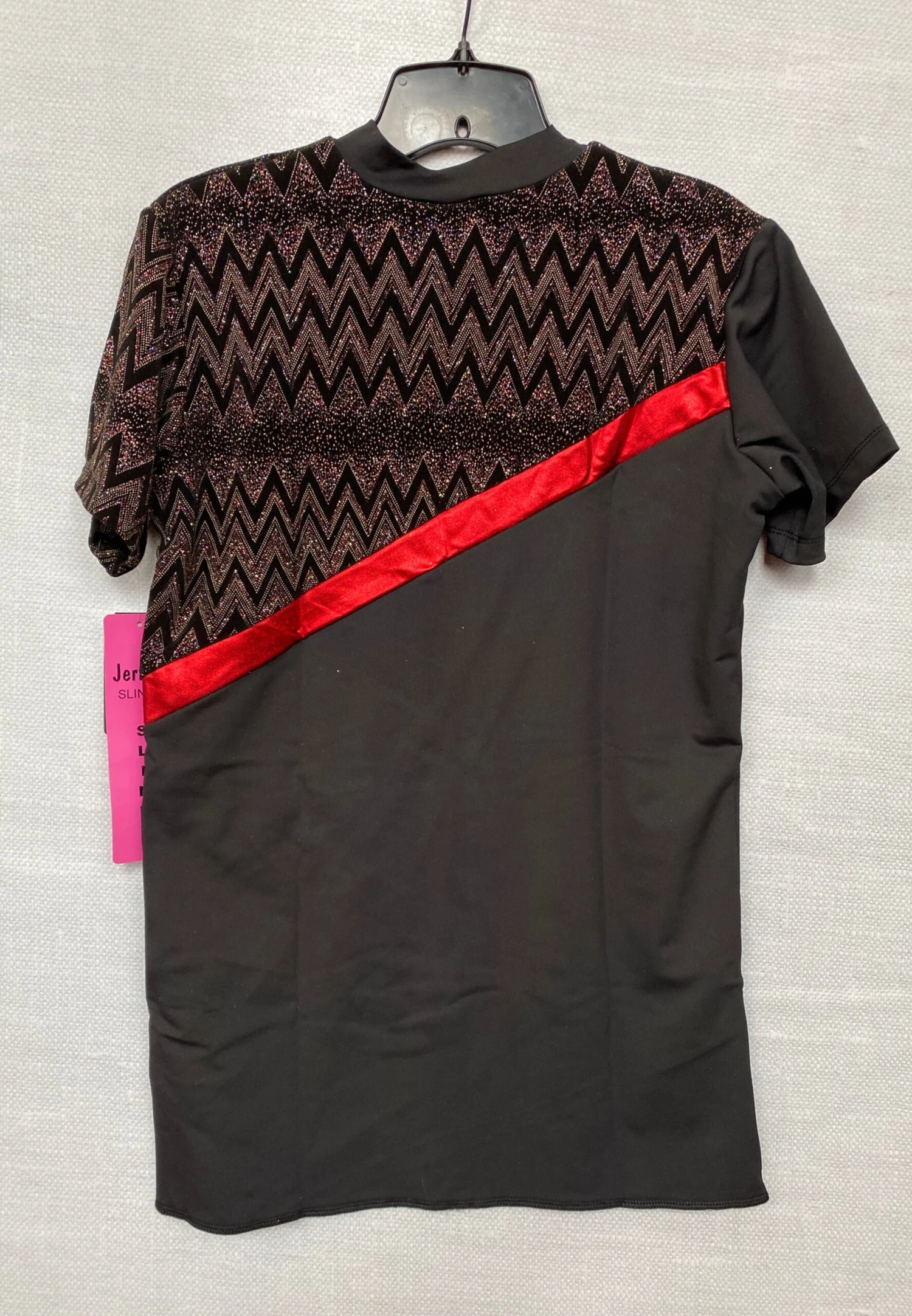 Short sleeve men’s skating shirt, slinky glitter lycra on top, black lycra on bottom.Â