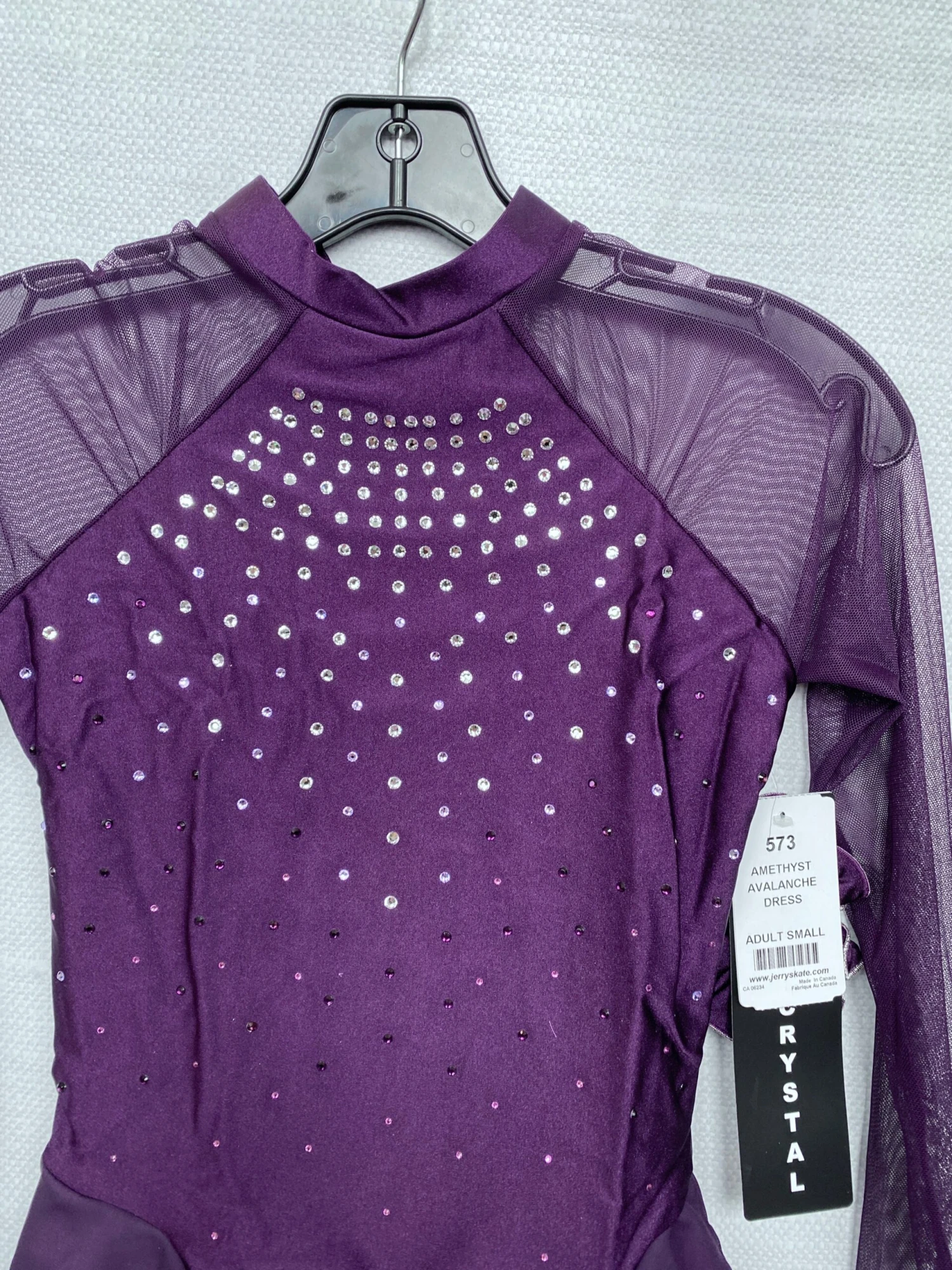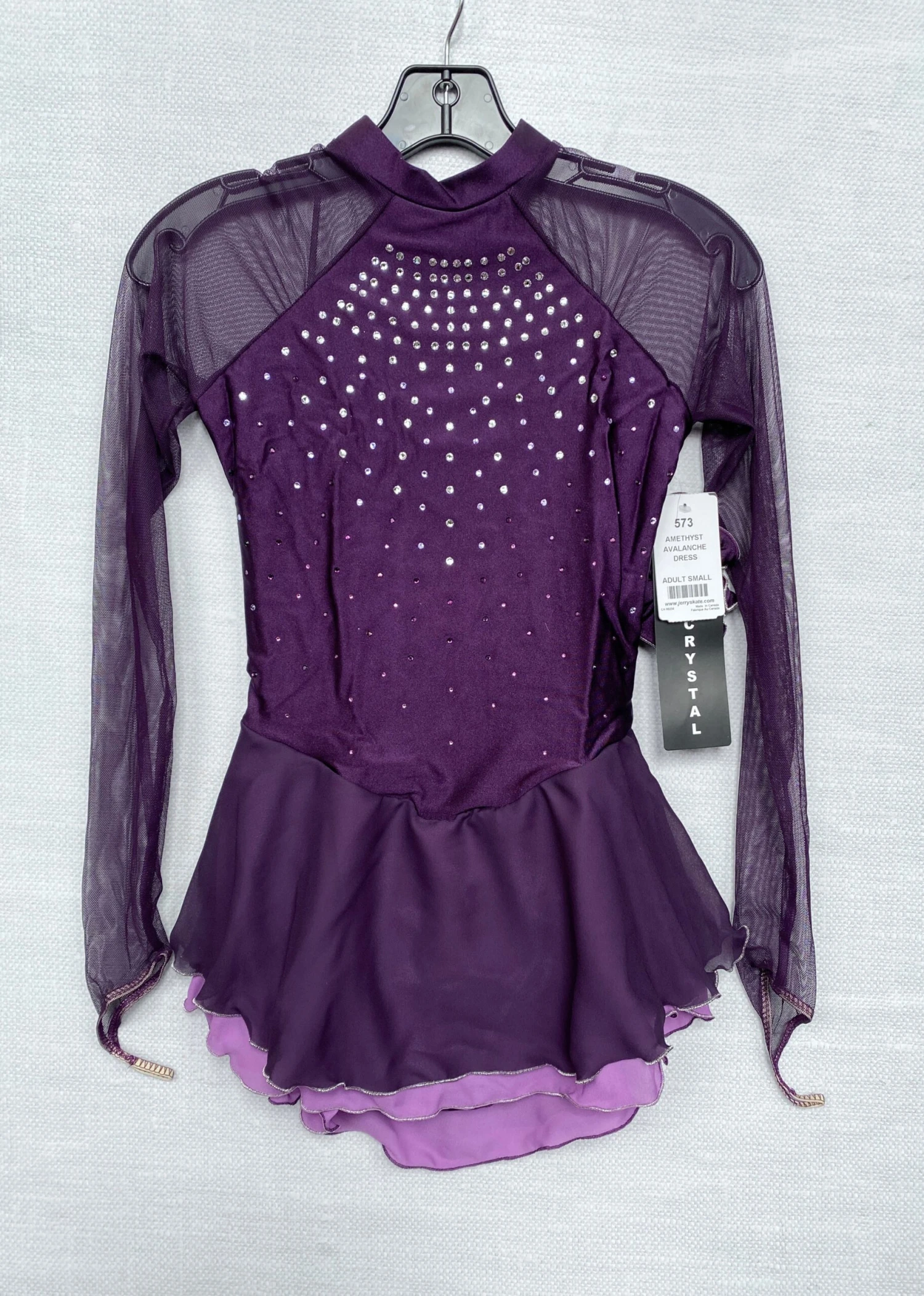 Jewel toned lycra skating dress in deep purple with a cascade of multi colored crystals front and back. Long mesh sleeves with finger points, classic keyhole back, double layer georgette skirt. Lined.Â