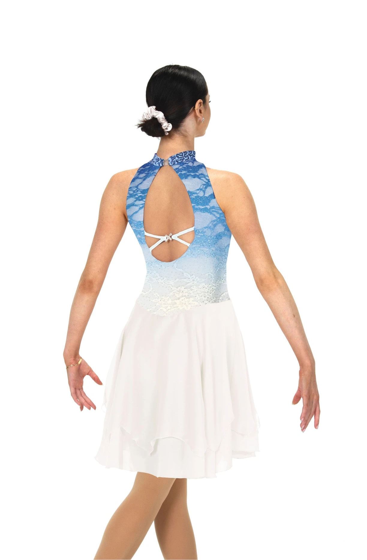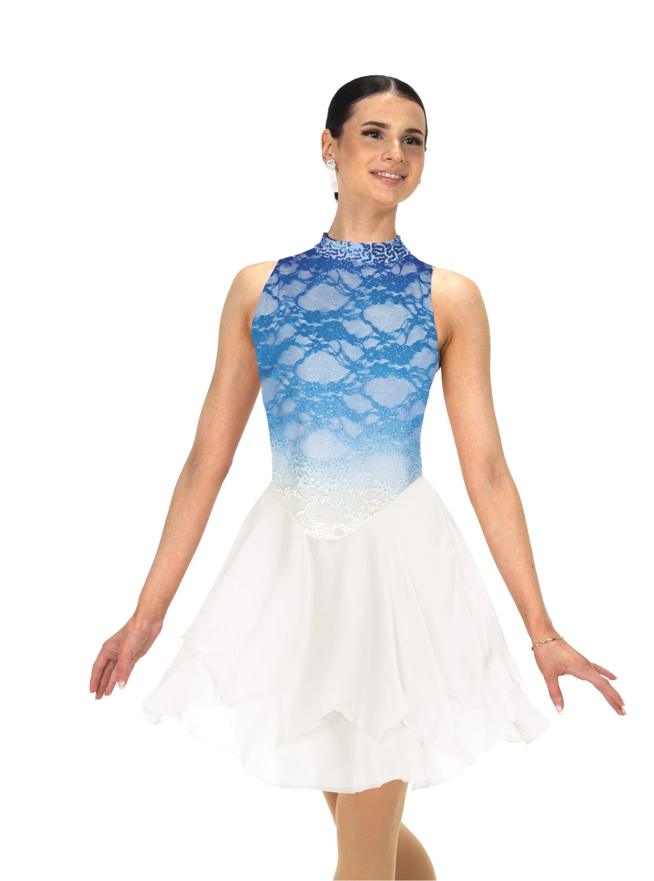 Shaded blue glitter lace that blends to white at the waist and a double georgette skirt edged in silver to show off the tulip hem top skirt. A classic back keyhole completes the look. Lined.