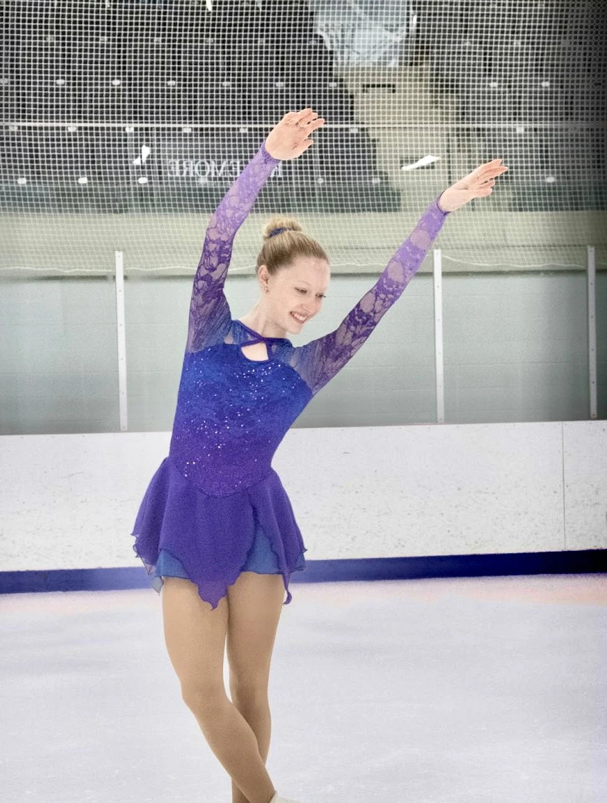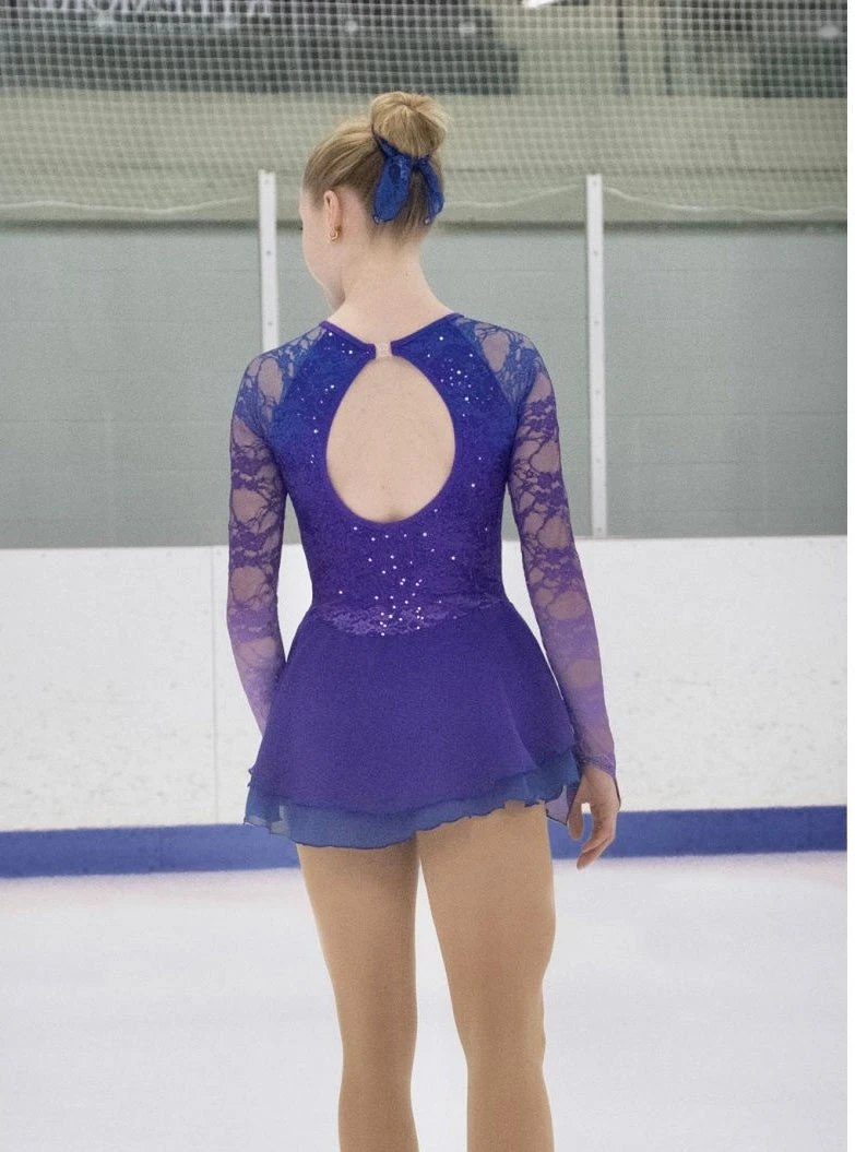 Shaded lace skating dress blends from flag blue at the shoulders to purple iris at the waist. Long lacy sleeves with finger points, a back keyhole and double layer georgette skirt of purple and blue are complemented by the sparkle of sequins that line the bodice.