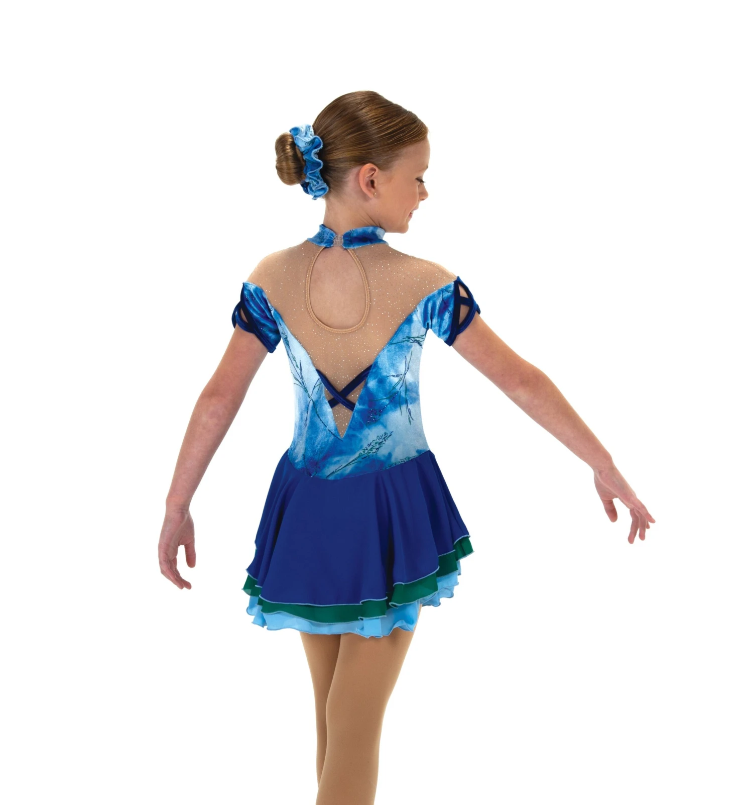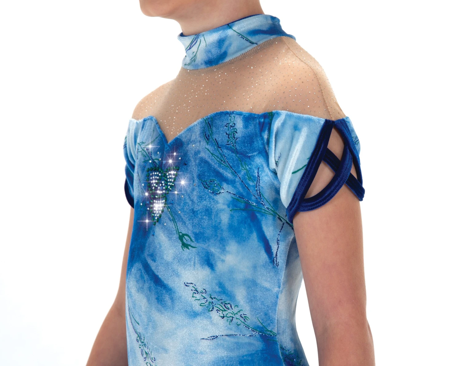 Glitter velvet skating dress in a blend of blues, crystal accent in front, shaped sleeves, triple layer georgette skirt.Â