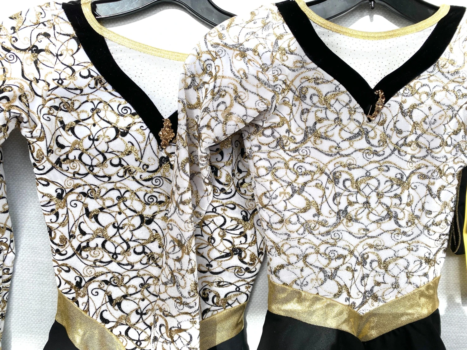 This perfectly polished skating dress combines swirls of gold and black glitter against snow white velvet. Finger points, a belted waistline, a double skirt edged in gold and a shaped neckline trimmed with black and gold complete the look. Lined.