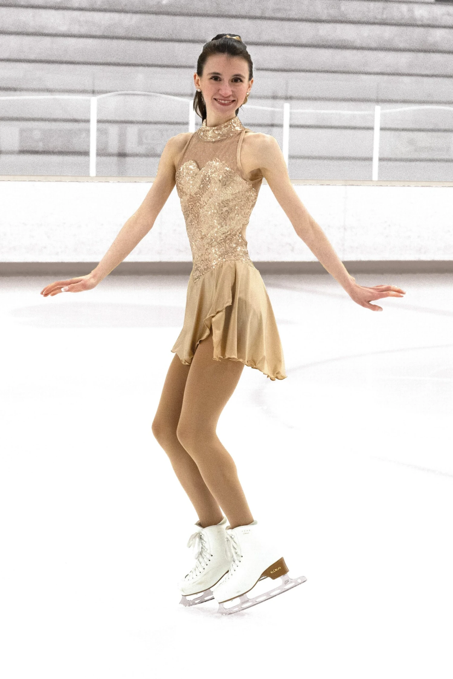 This sequin skating dress is stunning in soft gold. Satiny skirt splits and wraps at the front. Low back with a sequin bow and golden crustal buckle. Fully lined.Â