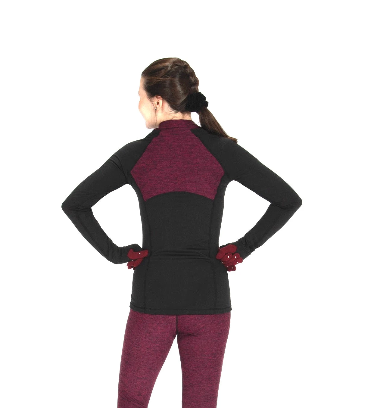 Quick drying supplex skating jacket with long palm length sleeves, shaped hourglass heather front core and paneled back