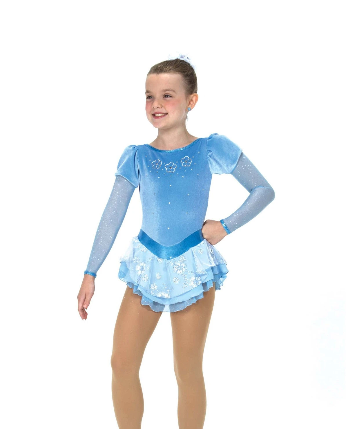 Soft velvet dress with pretty short puff sleeves above glitter mesh, a triple layer skirt of crystallized mesh over georgette and a trimmed waist with hologram shimmer. A locket style back keyhole and trio of sparkling crystal flowers at the front add finesse. Lined.