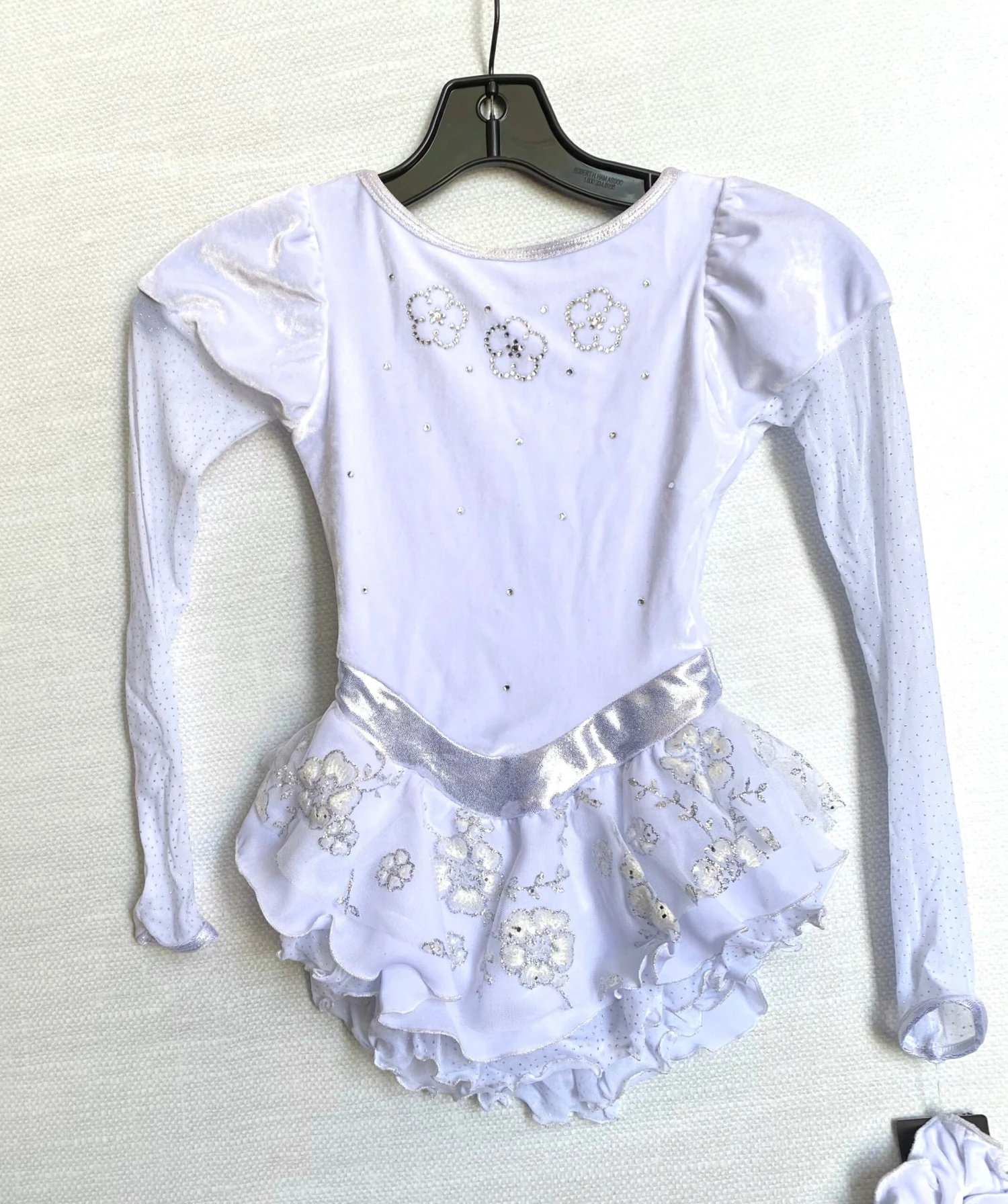 Soft velvet dress with pretty short puff sleeves above glitter mesh, a triple layer skirt of crystallized mesh over georgette and a trimmed waist with hologram shimmer. A locket style back keyhole and trio of sparkling crystal flowers at the front add finesse. Lined.