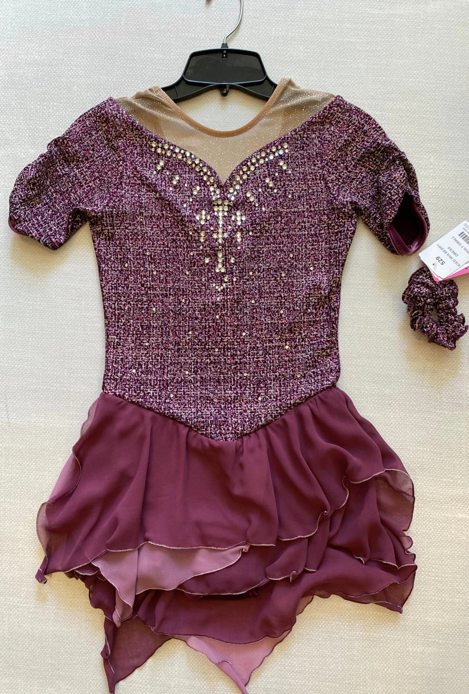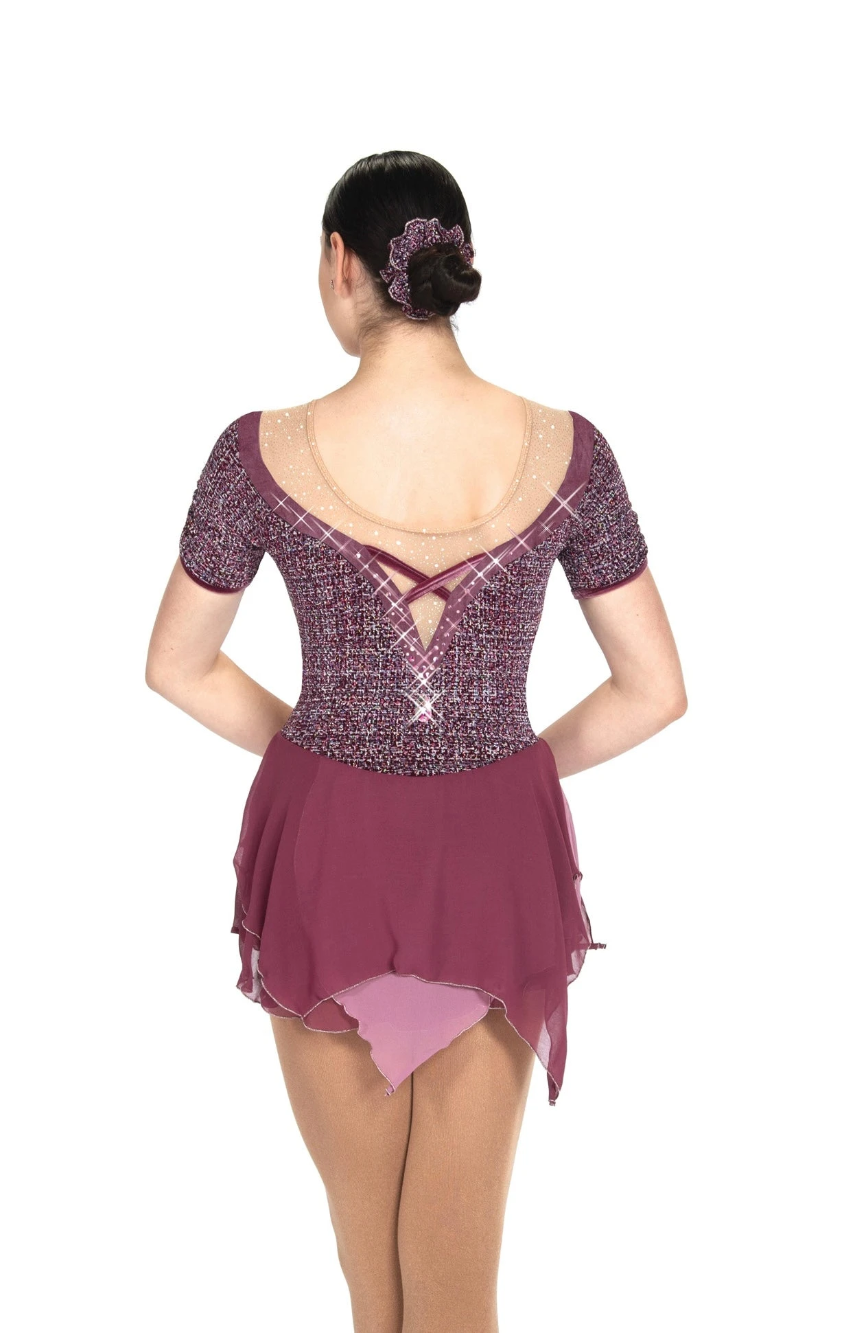 Falling somewhere between wine and amethyst, this mulberry colored slinky dress is covered in icy glitter and topped with sparkling crystals and a drop pendant along the jewel neckline. Little cap sleeves and a layered skirt add extra pizzazz. Lined.