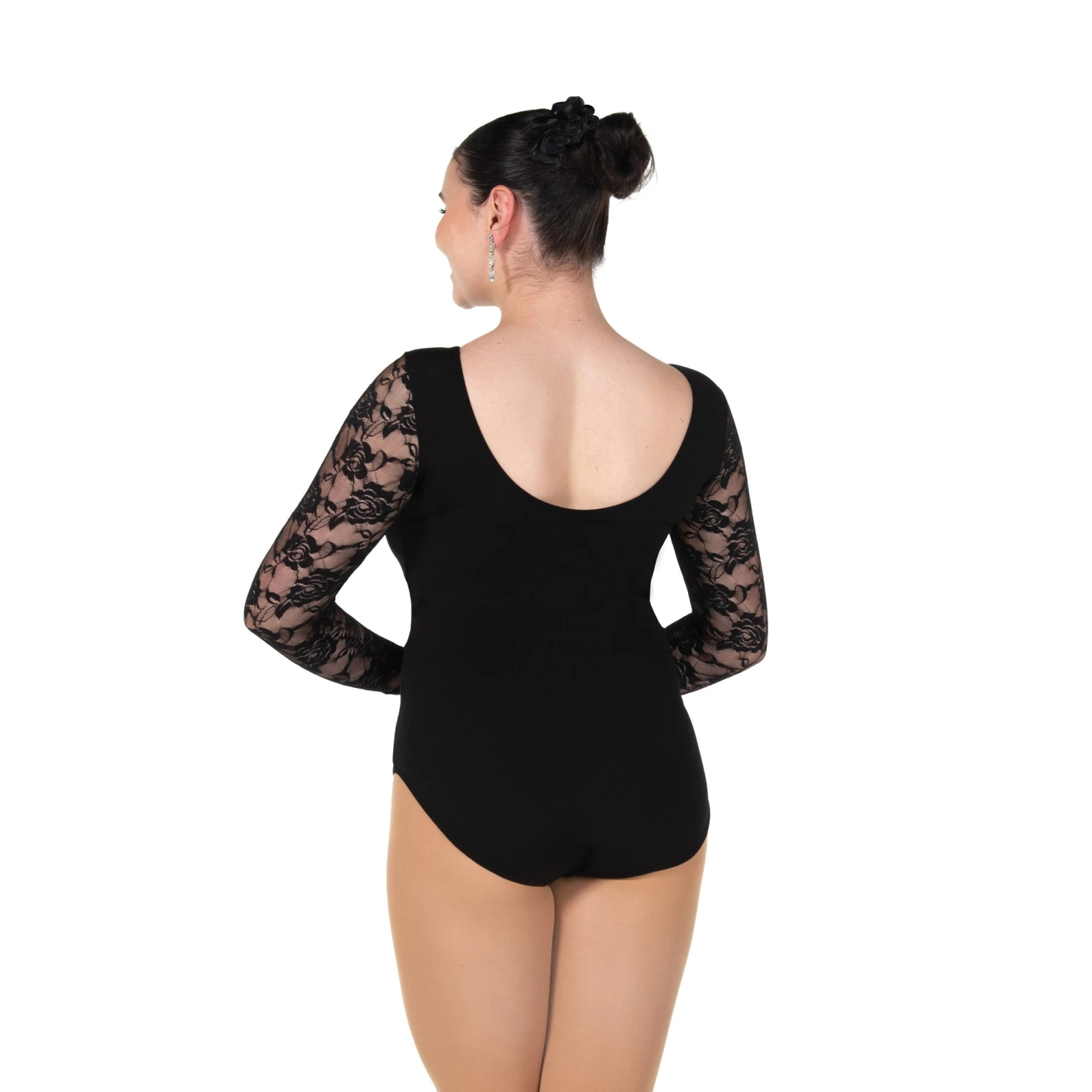 Black supplex bodysuit with a scoop neck and long black lace sleeves.