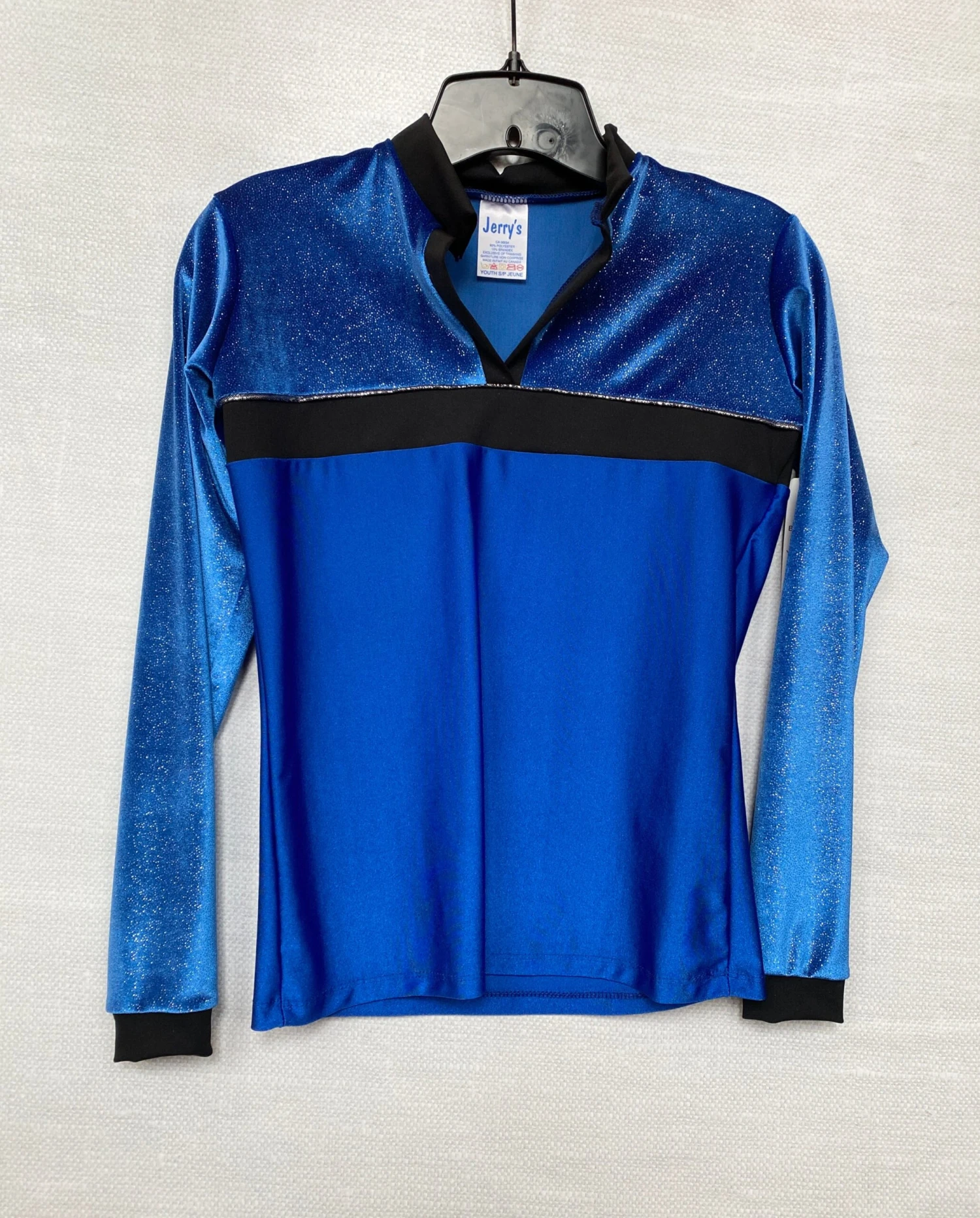 Royal blue skating shirt. Velvet and lycra with split collar and horizontal stripe in black with subtle silver diamond velvet across the shoulders and sleeves.