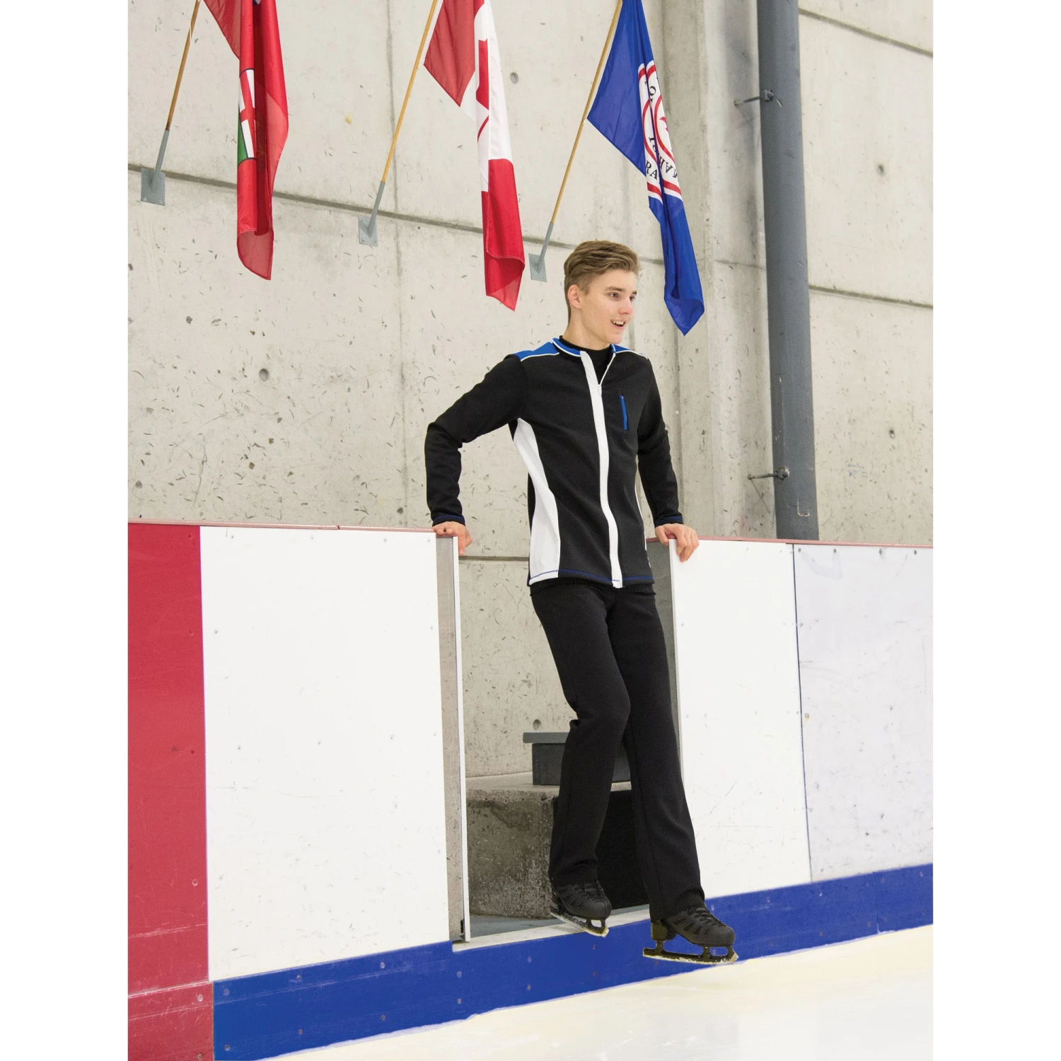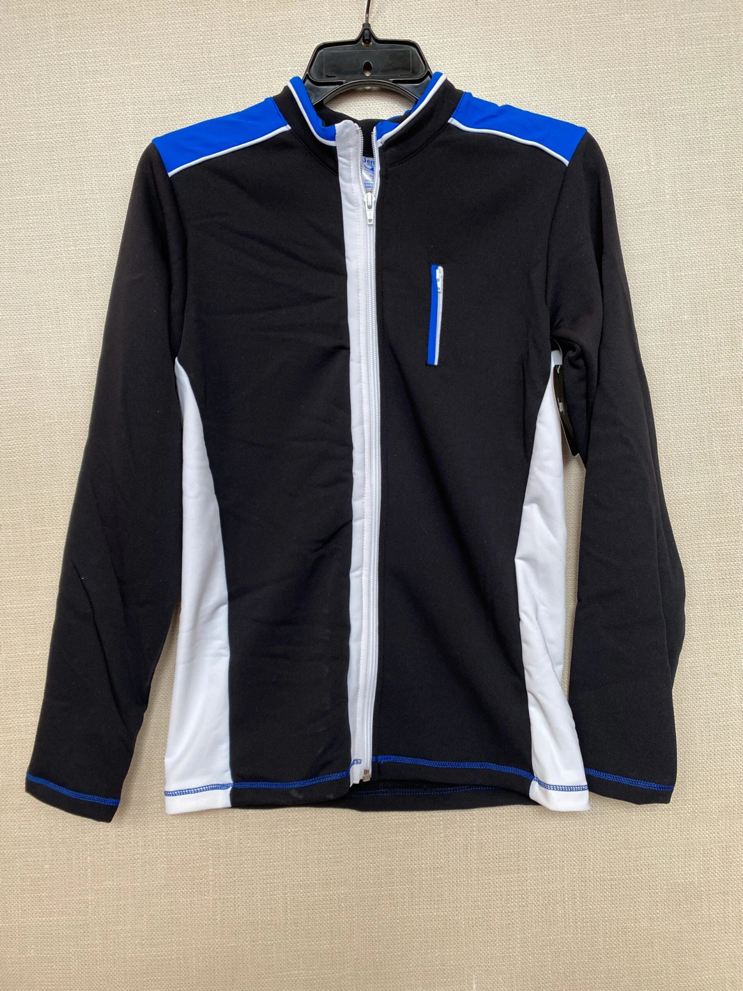 Men’s black sport jacket with front zipper, white and blue color accents, contrasting stitching and a handy zippered chest pocket.