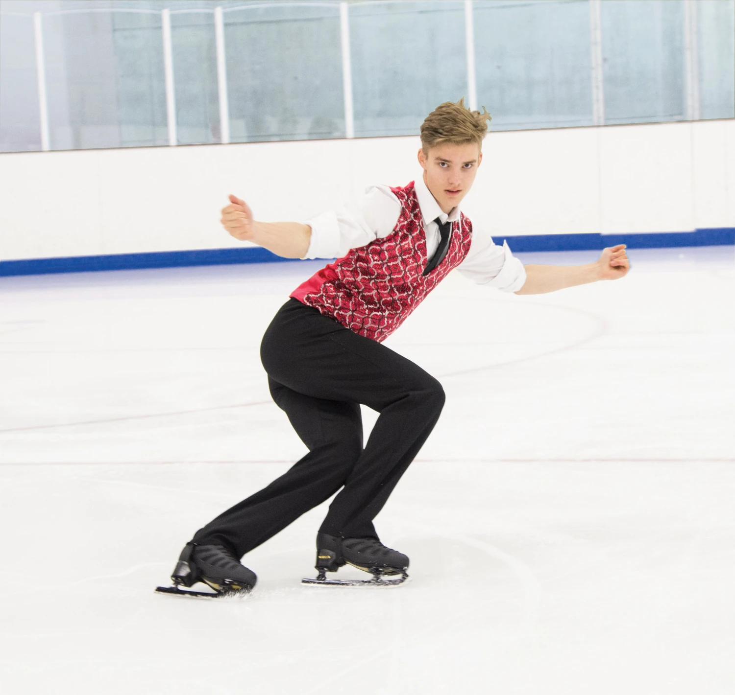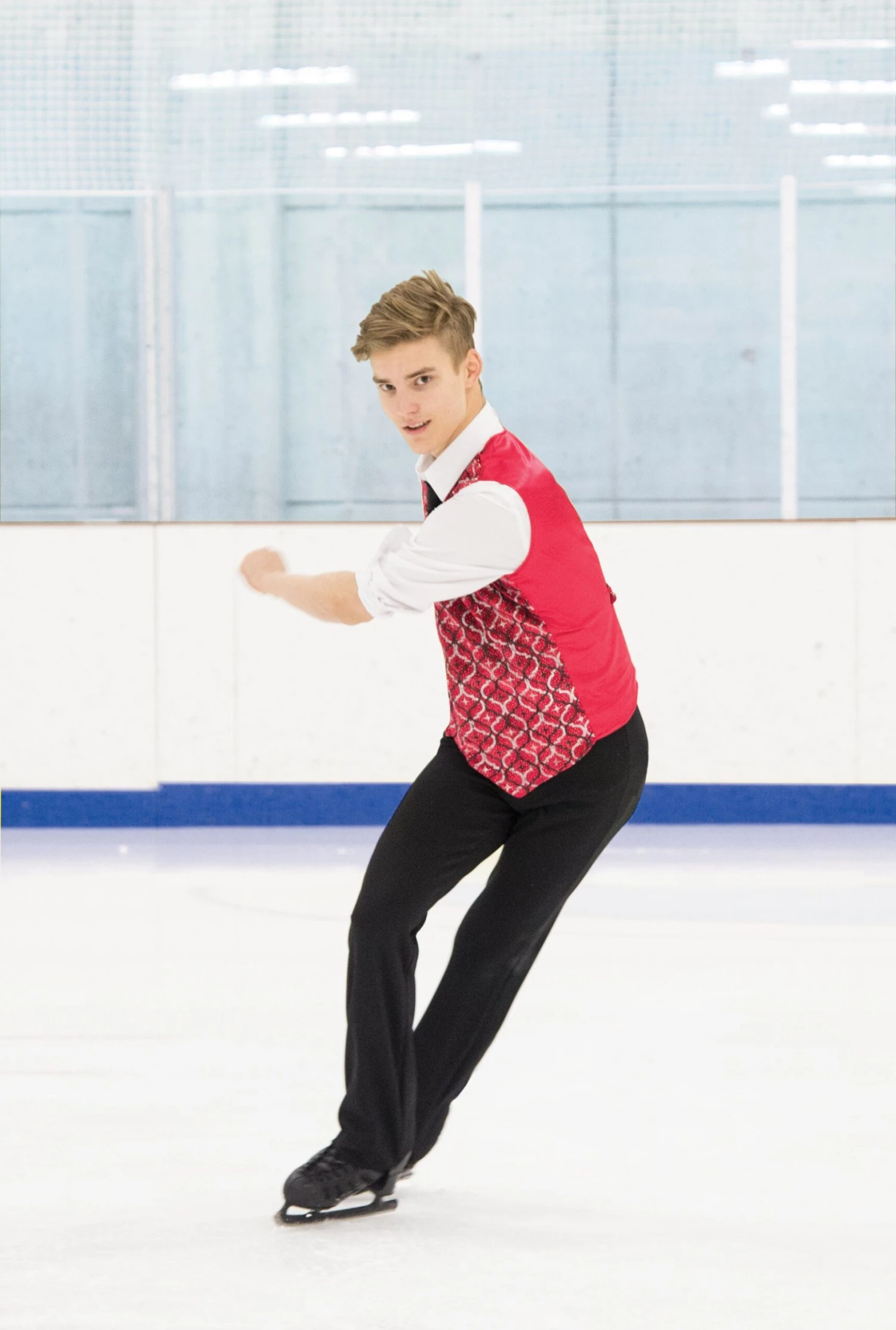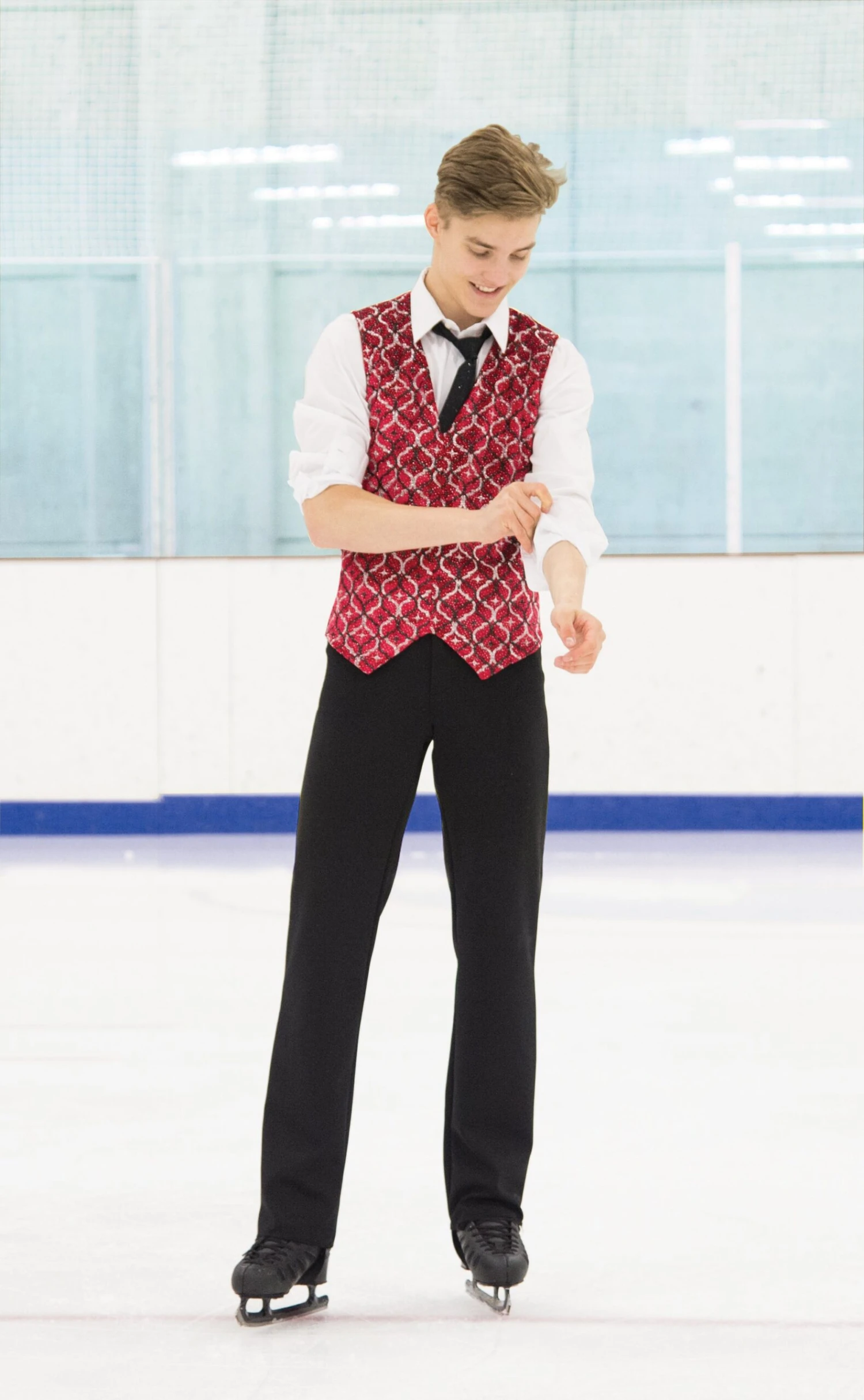 Traditional skating vest styling that always looks neat and tailored. Red, black and silver patterned glitter velvet front with plain red satin back.