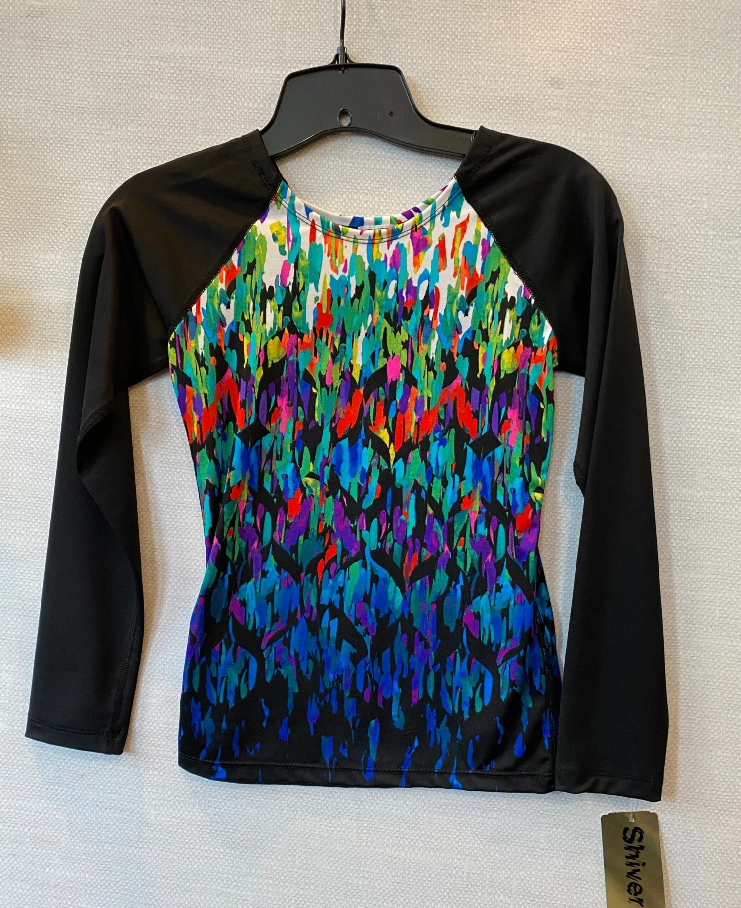 A jewel neckline, black raglan sleeves and a fabulous impressionistic print combine for an easy care, easy wear masterpiece.
