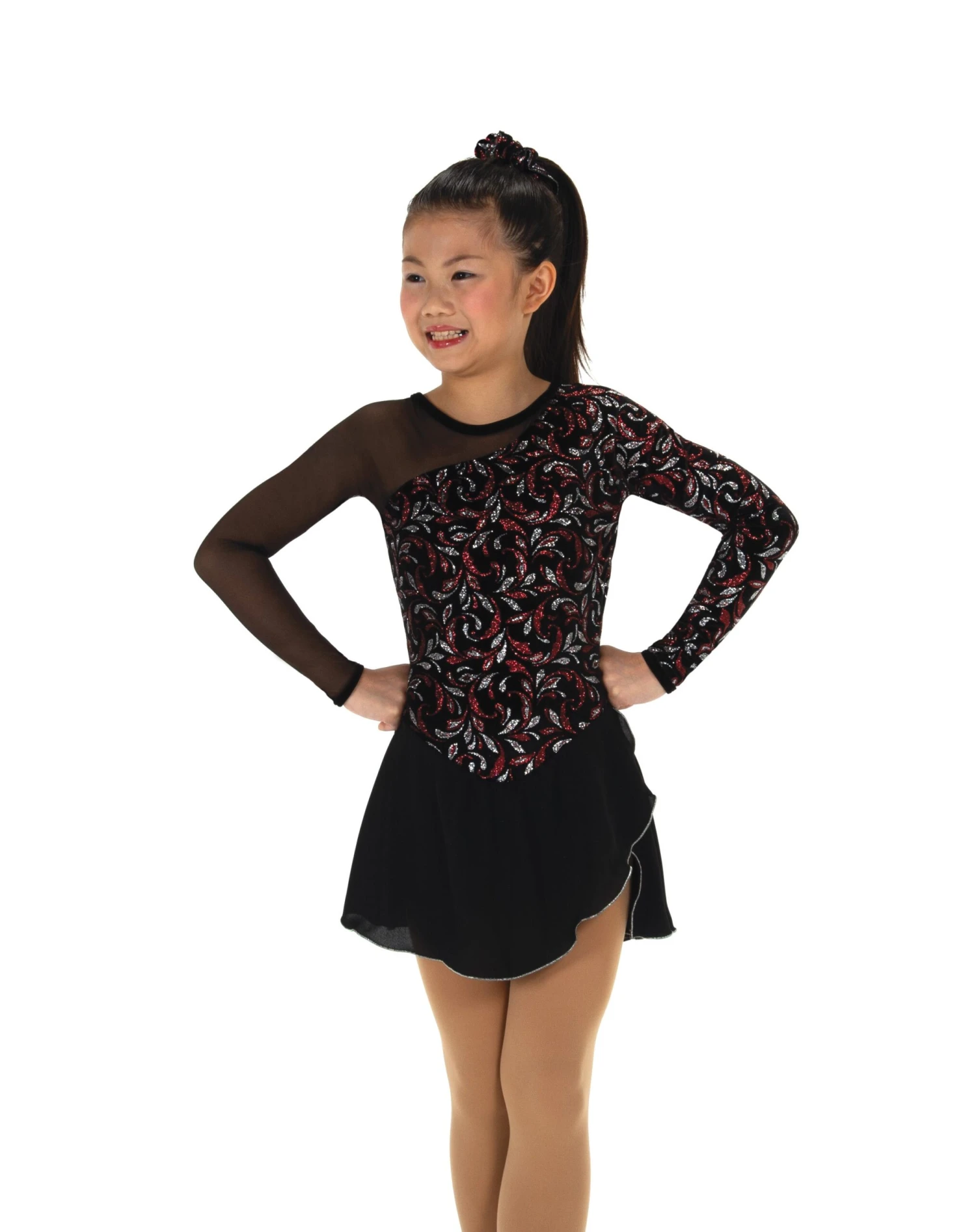 Black glitter velvet skating dress, one mesh sleeve, mock wrap skirt, cat’s eye keyhole strappy back.Â