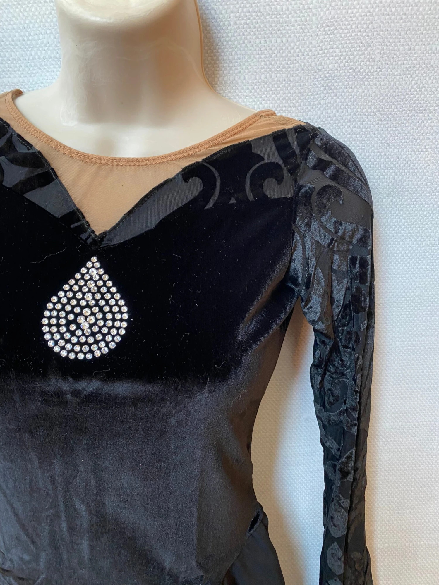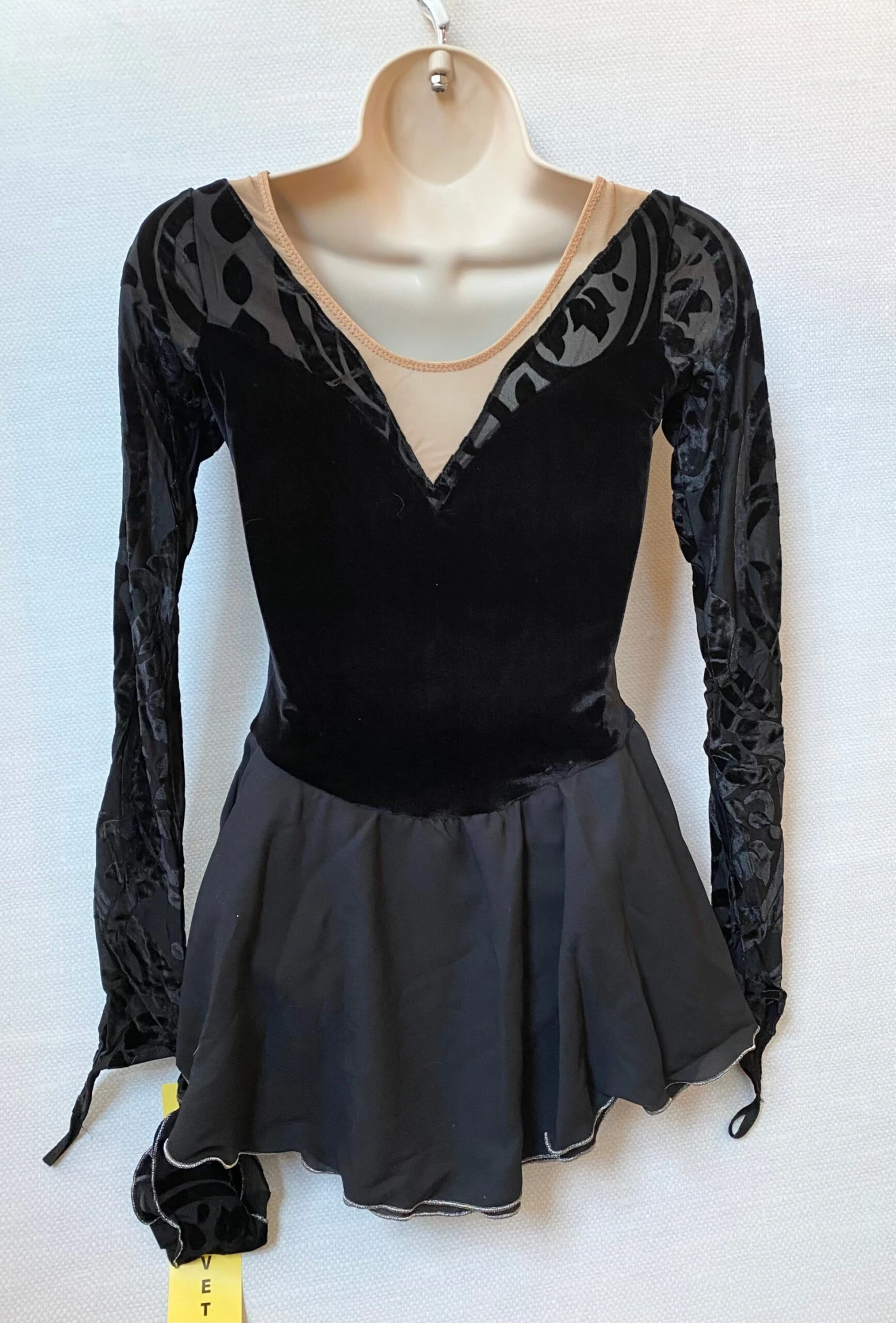 Black velvet skating dress with sheer flocked velvet sleeves, finger points, a double layer princess style skirt edged ink