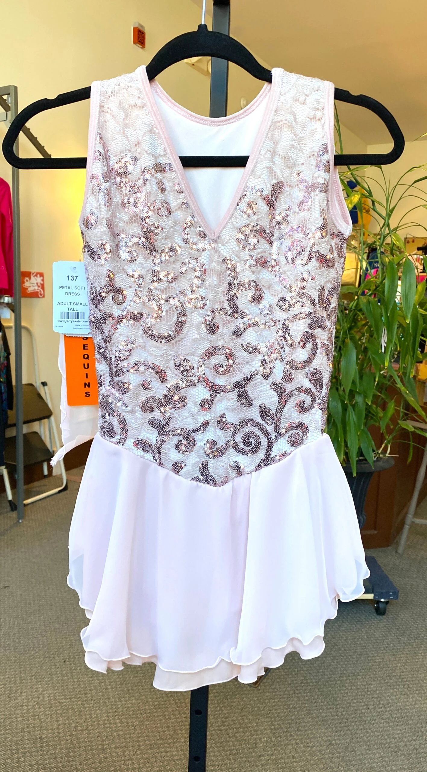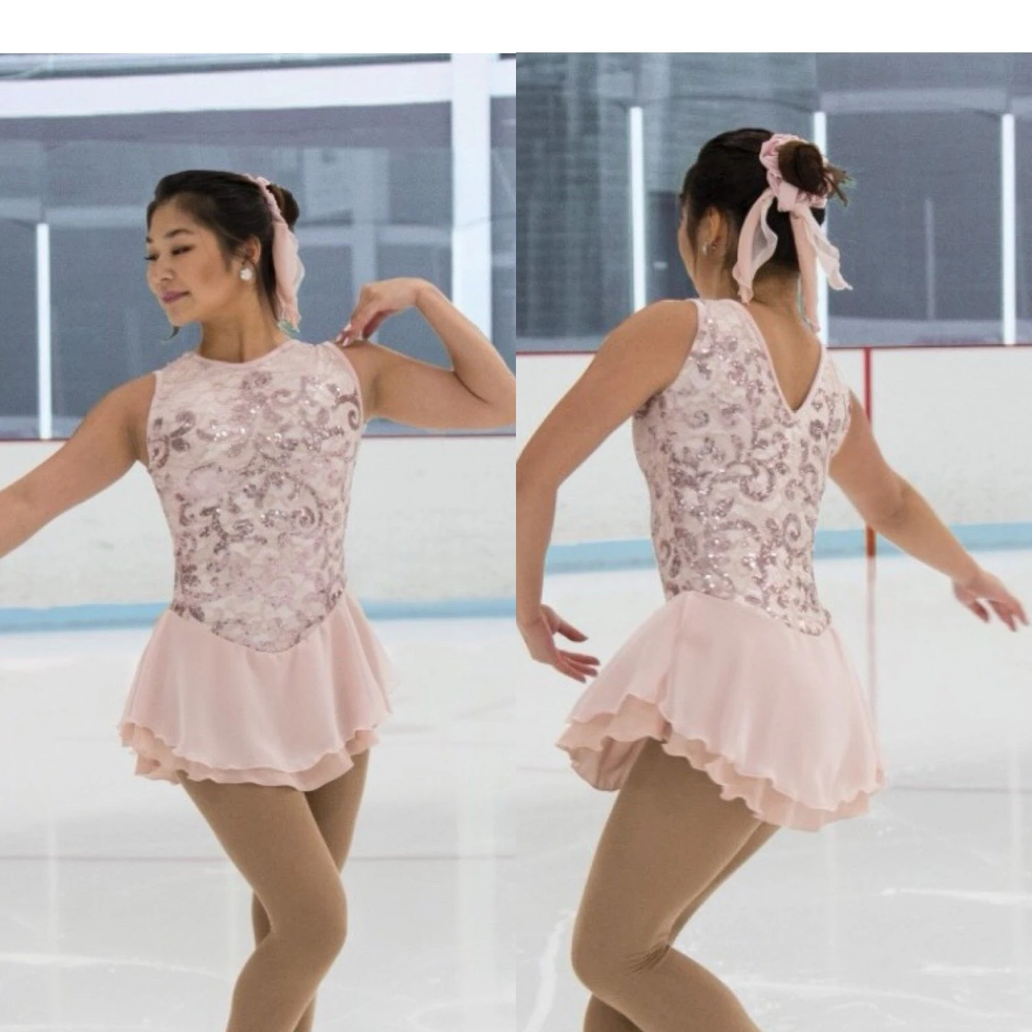 Blush pink satiny lycra with sequin embroidered lace overlay, double layer skirt.Â