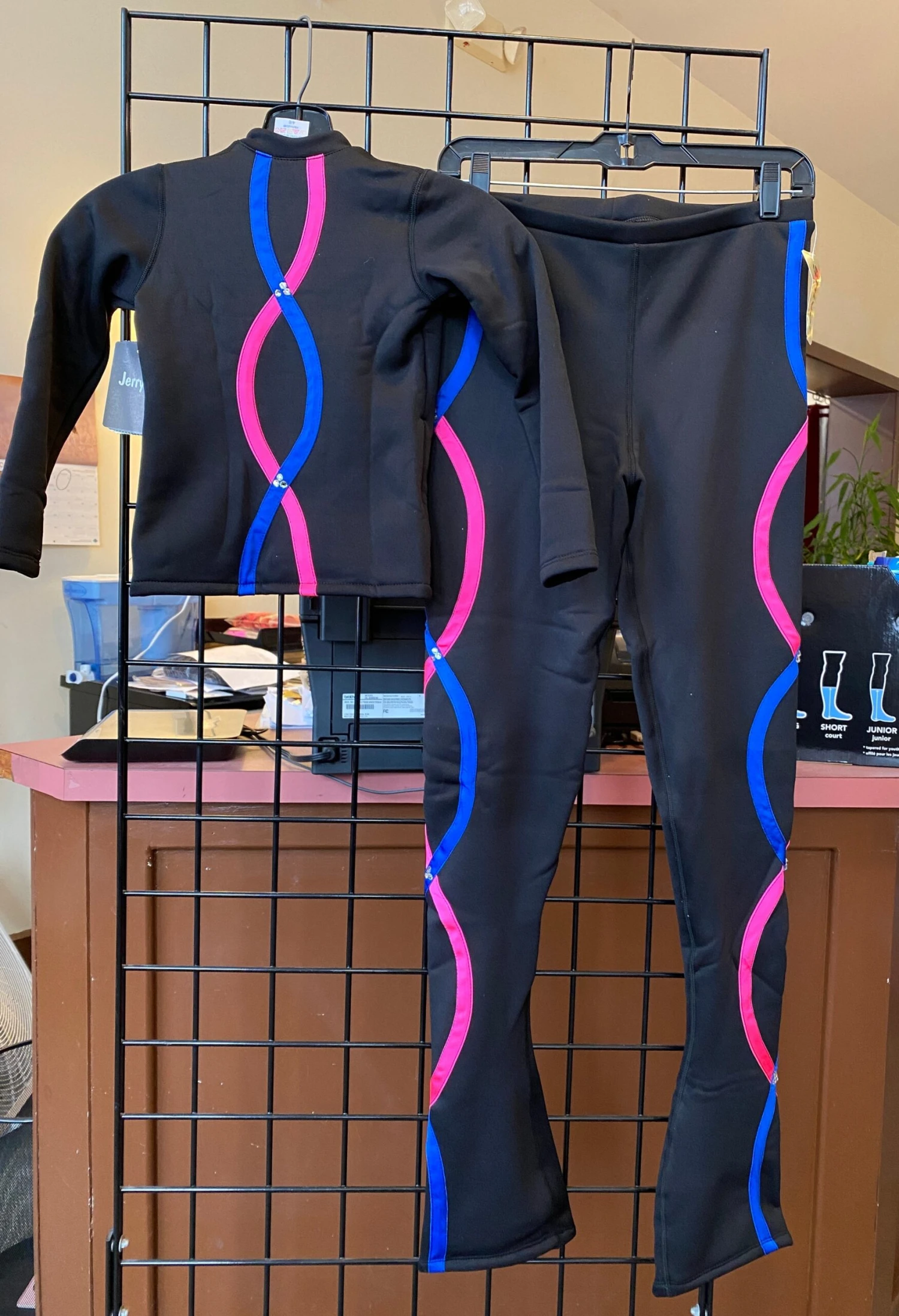 Warm, cozy fleece skating pants. Brushed inside for added softness, these thick black leggings are accented with rhinestones. Over the heel fit for longer leg line.