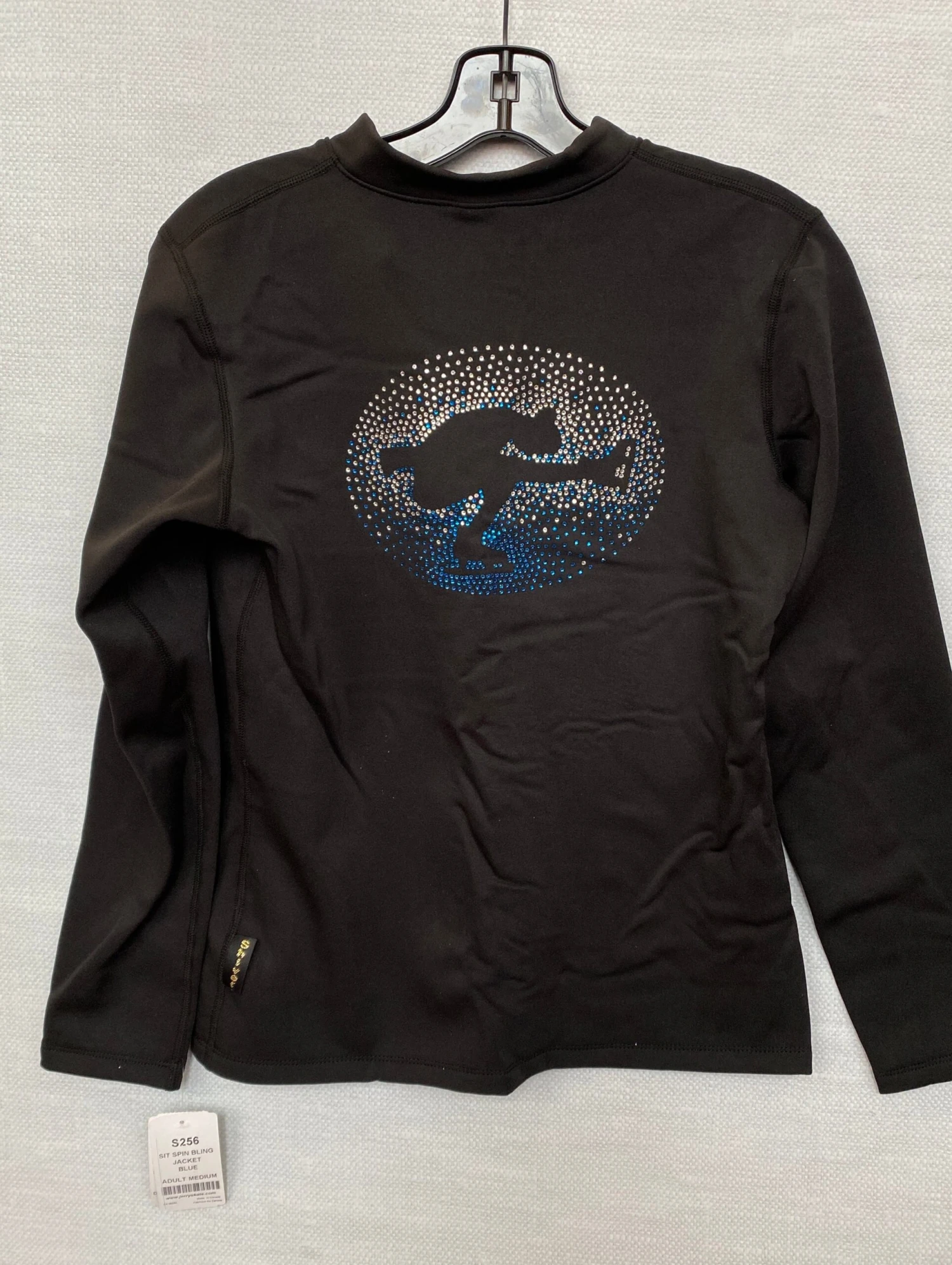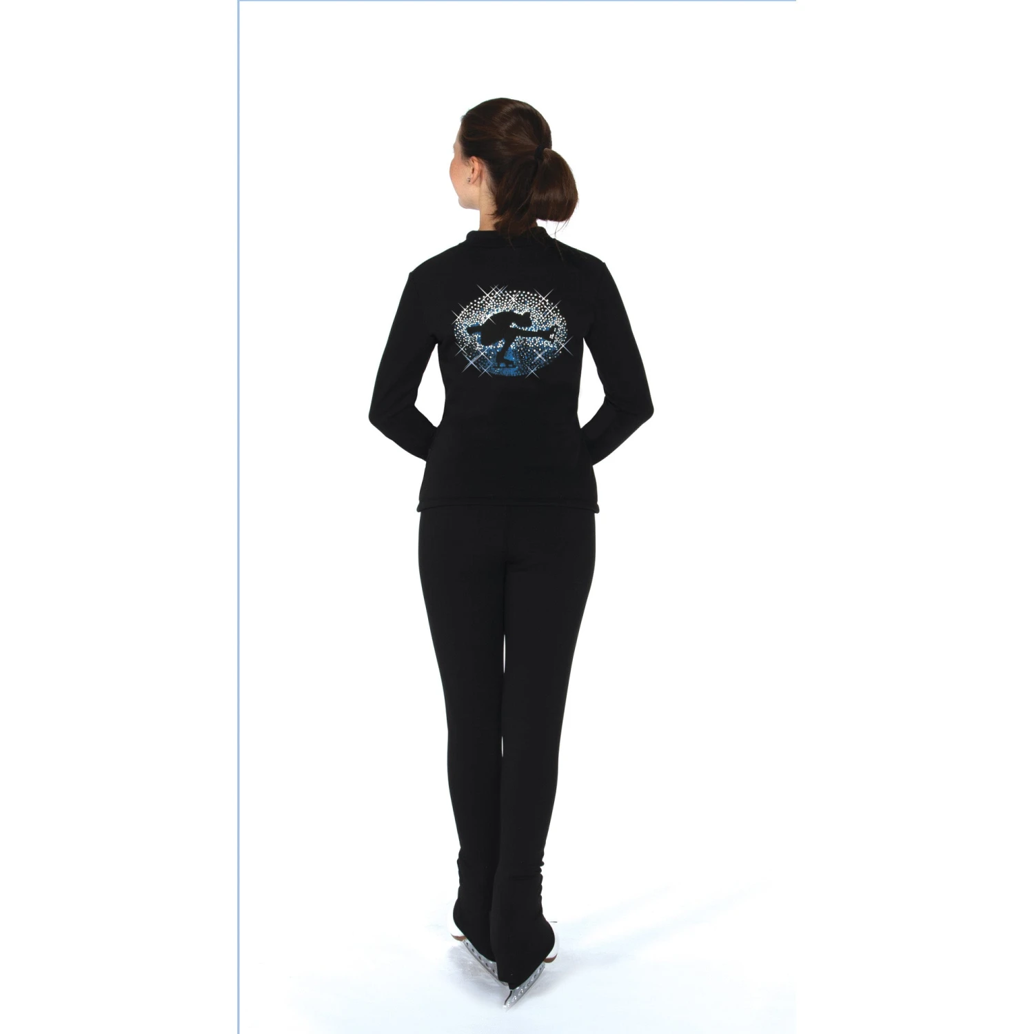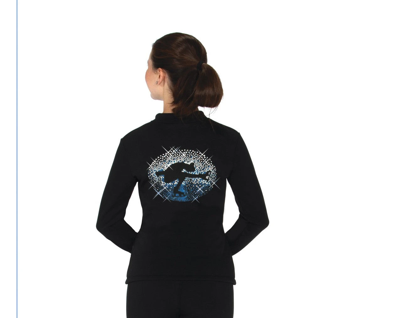 Black power fleece skating jacket with a cameo style crystal design. A sit spin silhouette shading from clear to color crystals. Â