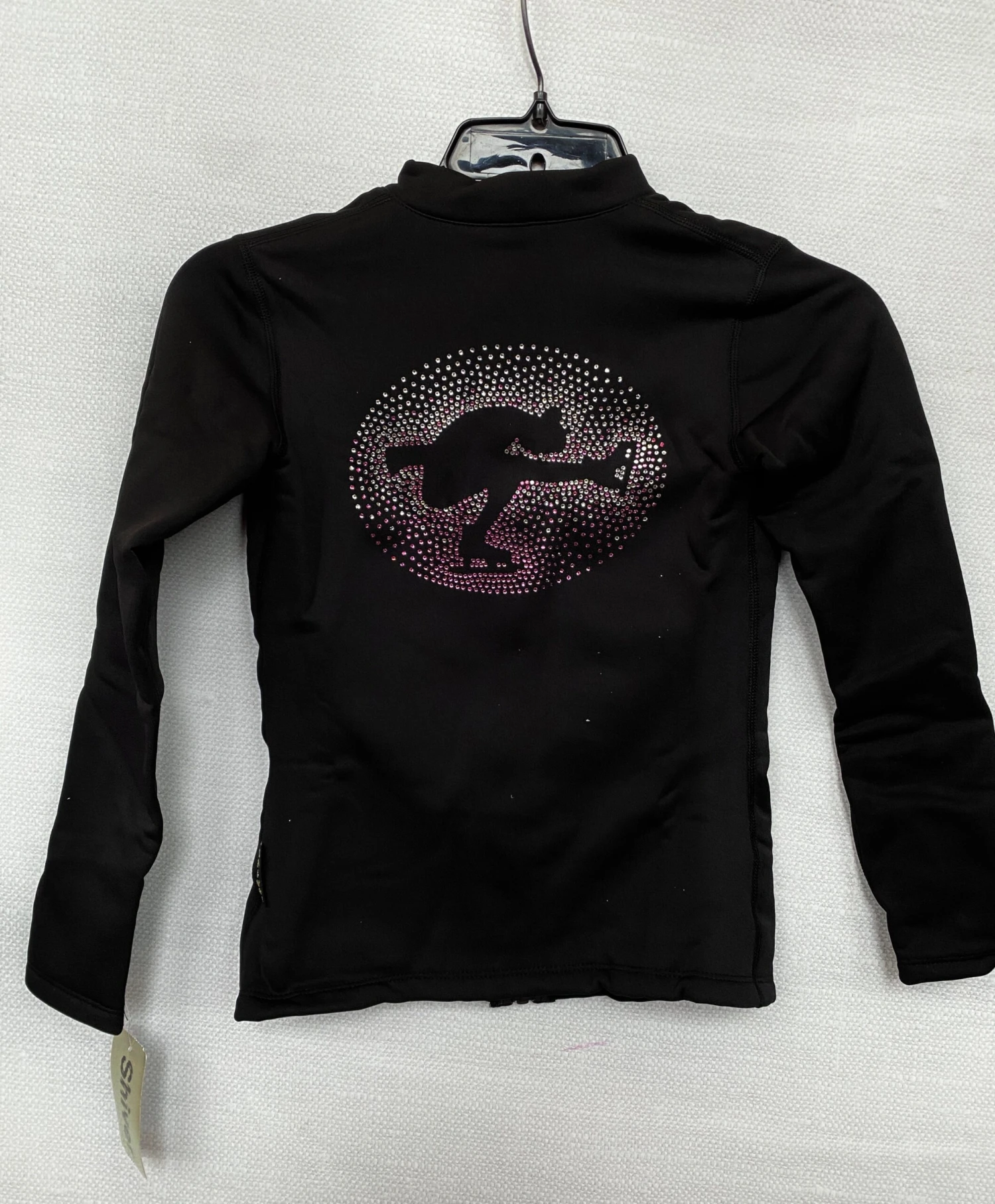 Black power fleece skating jacket with a cameo style crystal design. A sit spin silhouette shading from clear to color crystals. Â