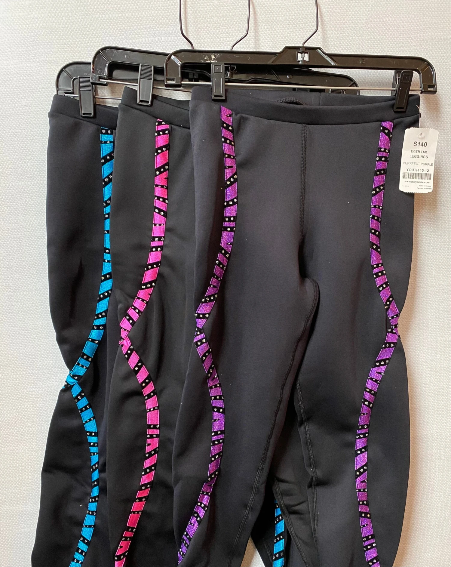 Add a little bounce to practices with these Tigger approved styles! Black power fleece leggings are brushed inside for softness and warmth, and feature a hologram ribbon with flocked velvet tiger print studded with silver glitter.