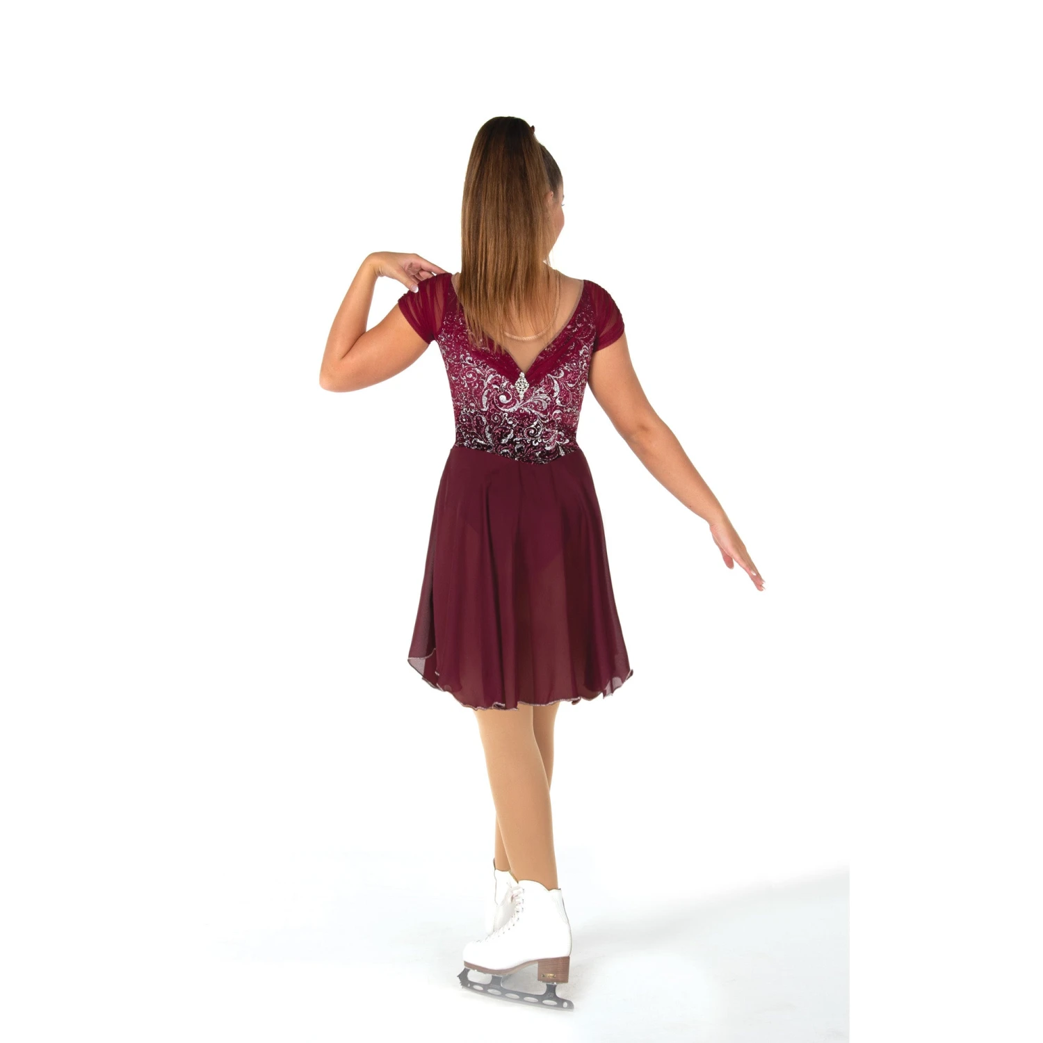 Gathered wine mesh along the neckline and in the petite sleeves adds feminine charm to this rich burgundy dress. Crystal accents and silver edging on the georgette skirt finish the look.
