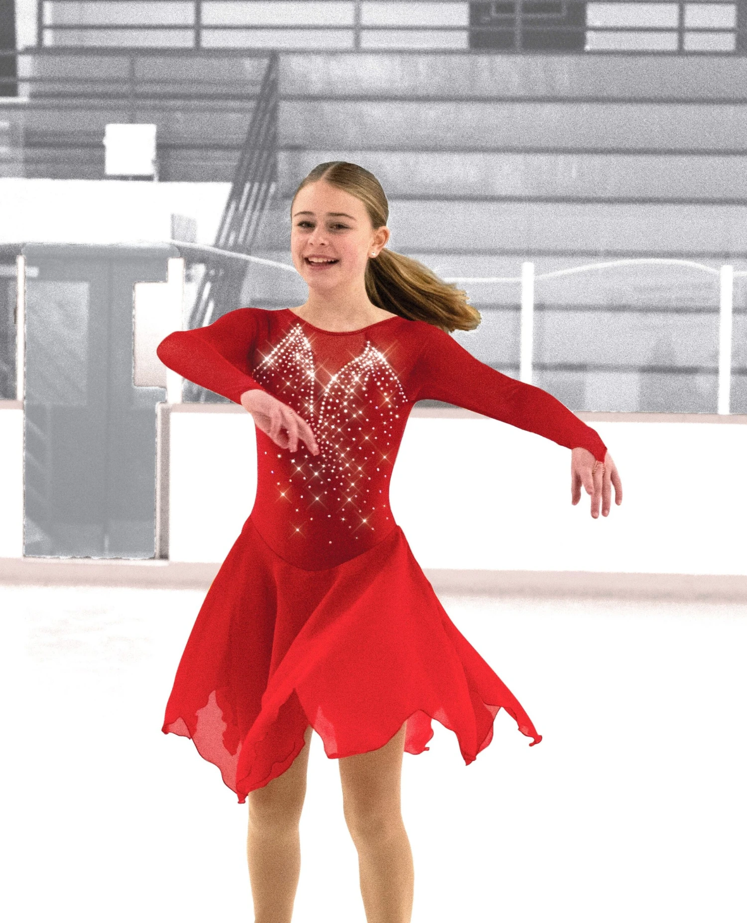 Lycra ice dance skating dress with flame style bodice, sheer mesh sleeves with finger points, wavy edged dance length skirt, generous splash of crystals. Lined.Â