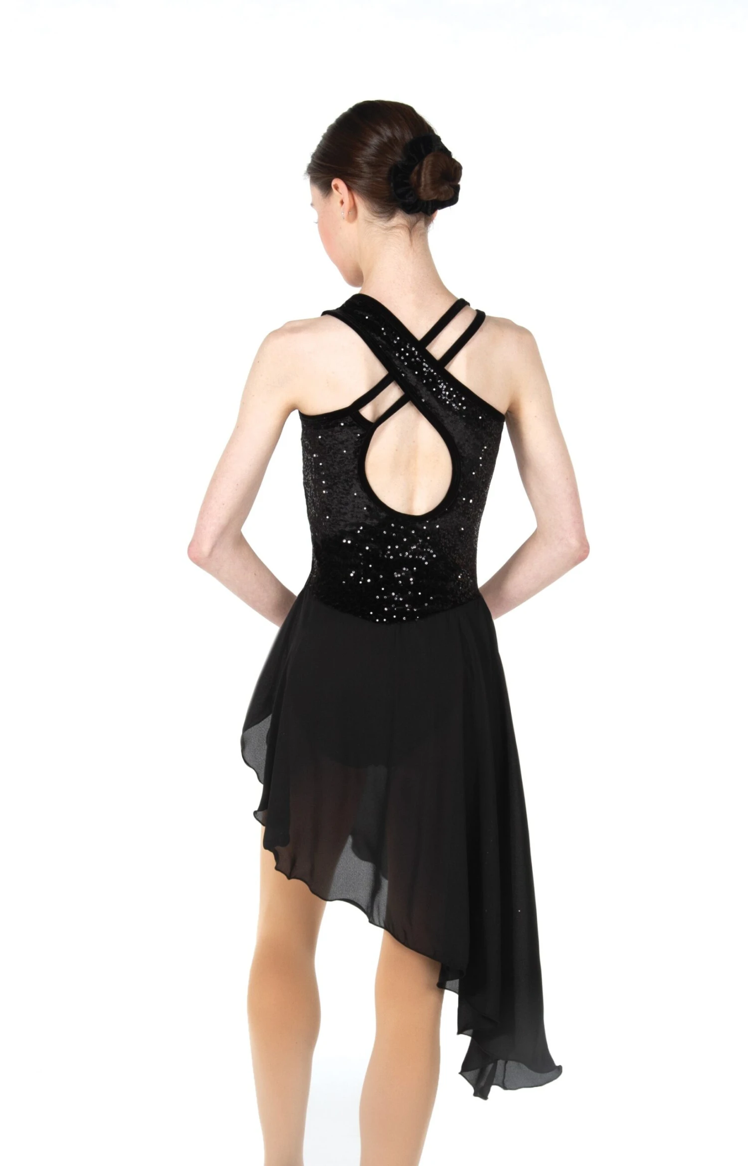A little ritzy, a little edgy, all out glam ice dance skating dress. Full sequin velvet body with a slim stiletto style keyhole at one shoulder and a pair of spaghetti straps at the other. Designed with a crossed keyhole back and angled georgette skirt.