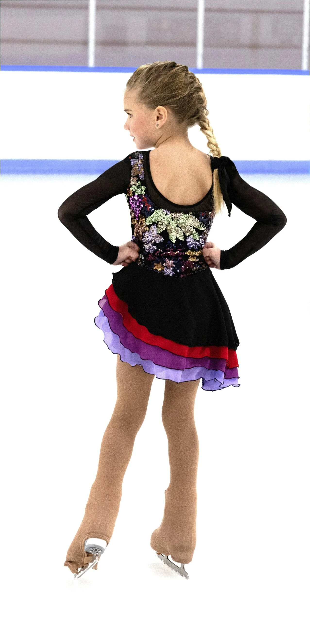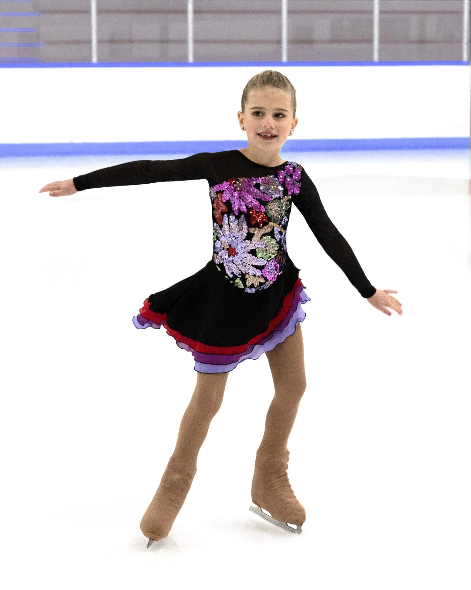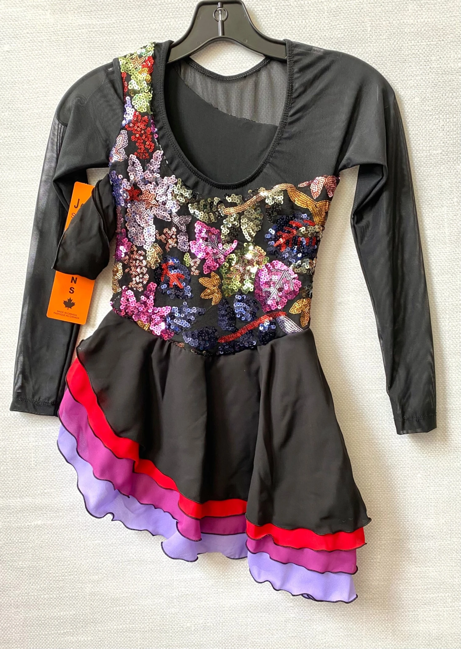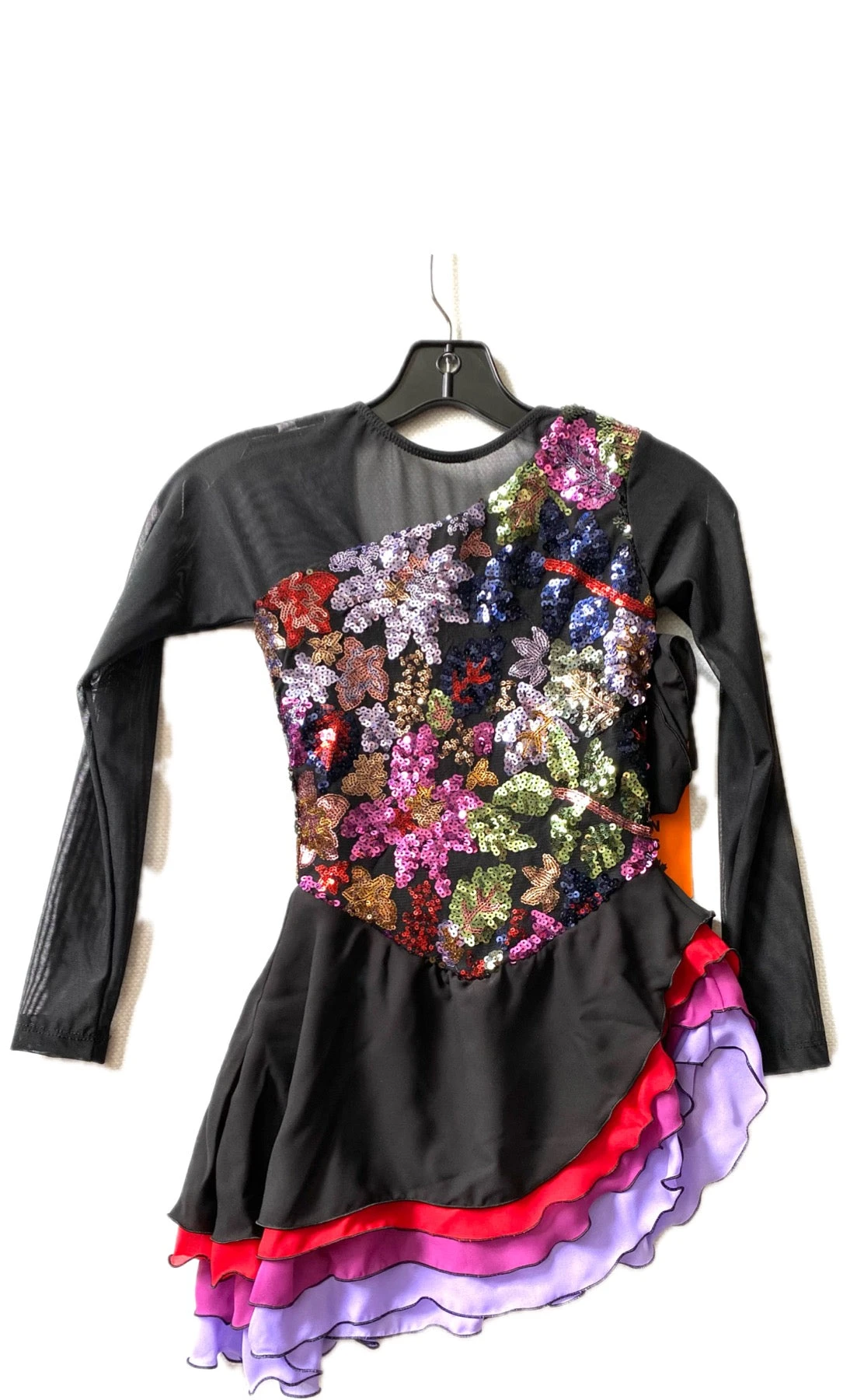 A vibrant skating dress with sequin flowers embroidered on black mesh. Multi layered skirt cut on an angle edged in black. Black mesh sleeves. Lined.
