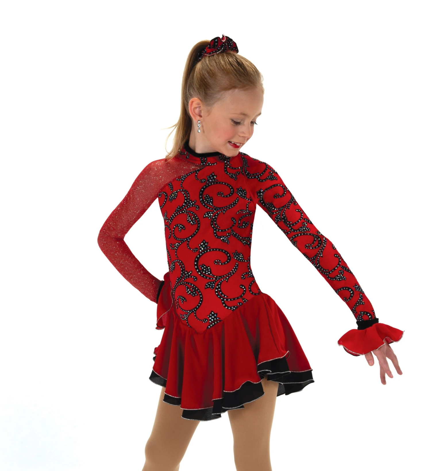 Classic red and black lycra skating dress, one mesh sleeve, ruffle cuffs and double layer georgette skirt of red over black, strappy back.Â