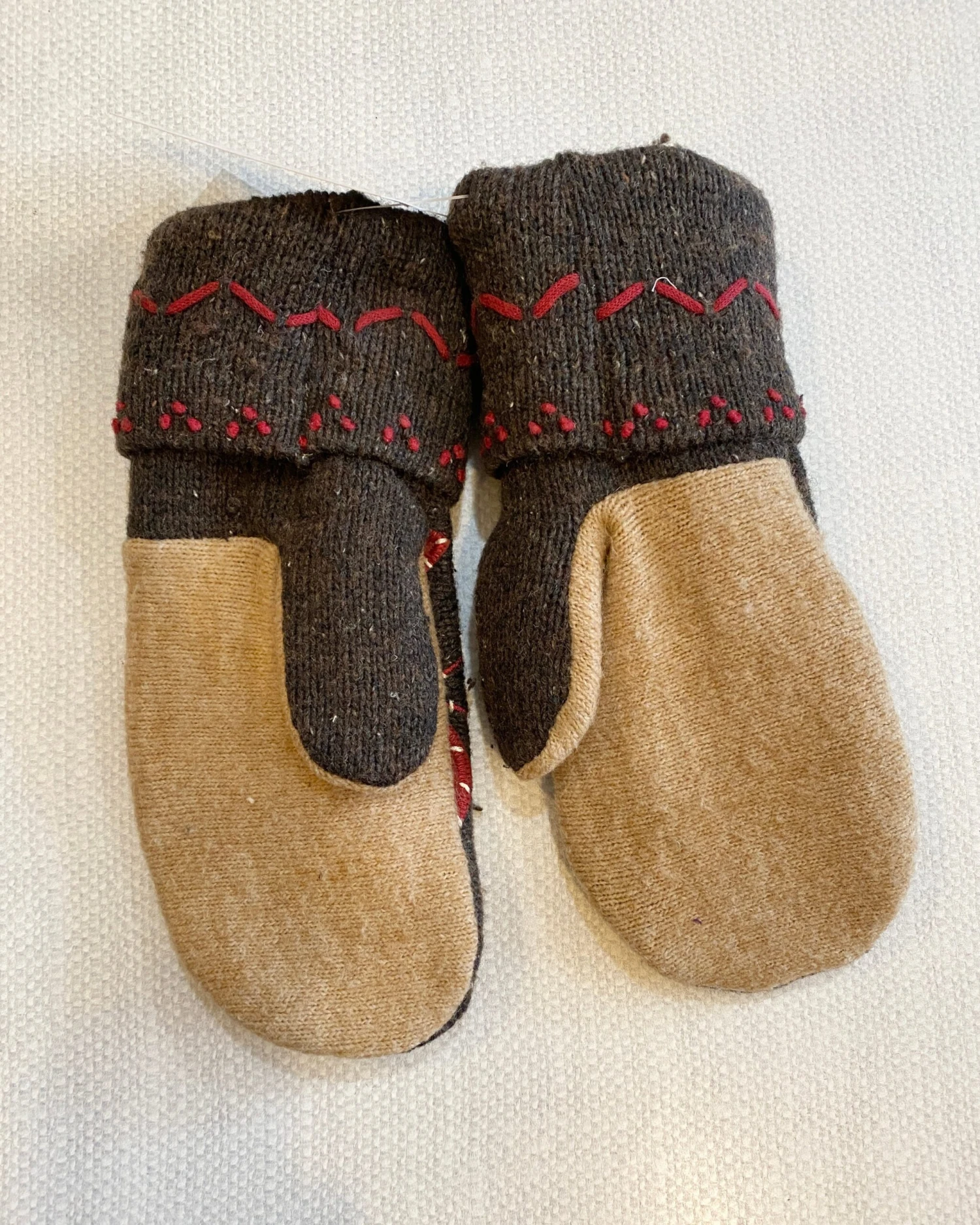 Upcycled sweater mittens with matching summarys to secure cuffs.