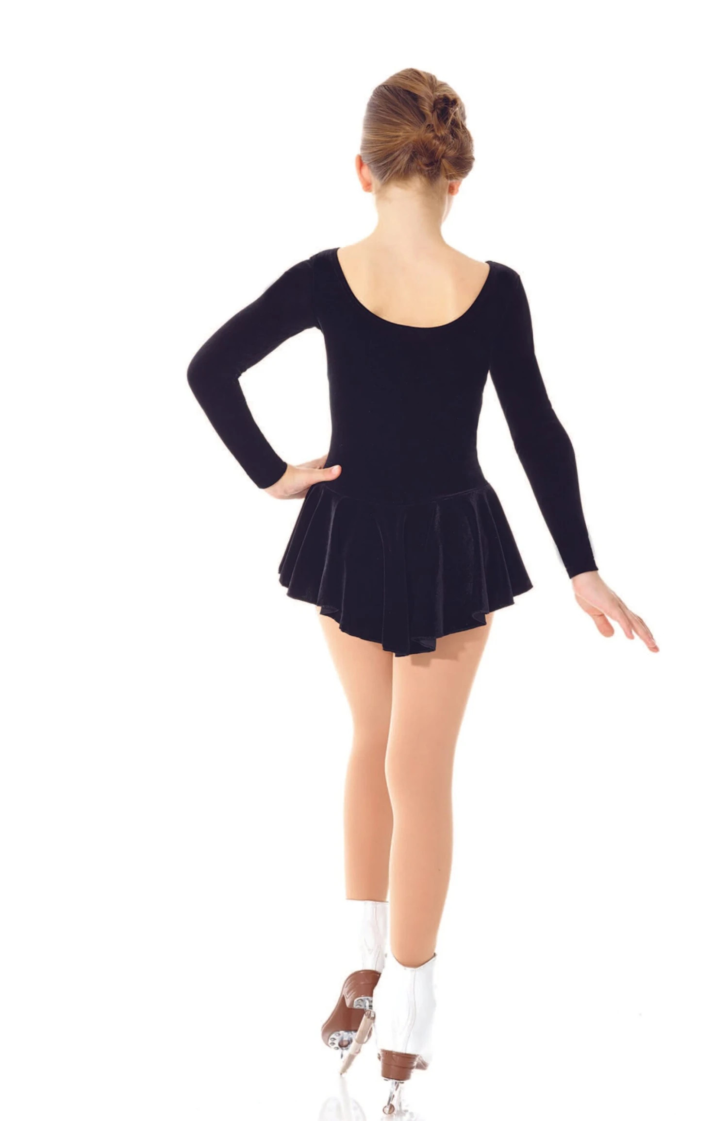 Plain black velvet skating dress, Long sleeves, Full skirt, Shelf bra, Hair tie included