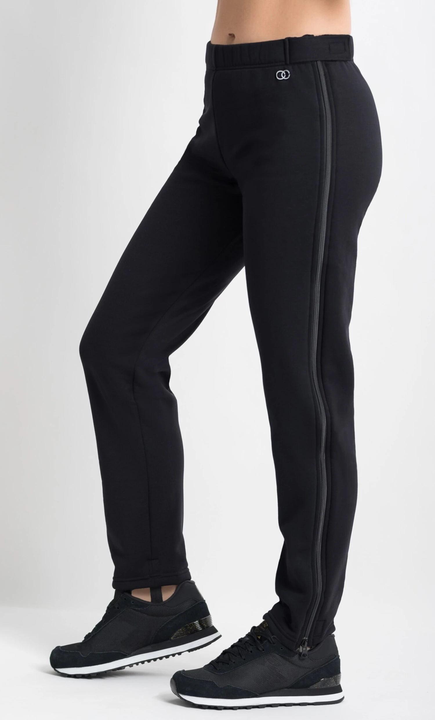 Pants with full length zipper on sides, 1 1/2″ folded elastic at waist, Removable stirrup. Warm Polartec. Keep warm between sessions without taking off your skates.