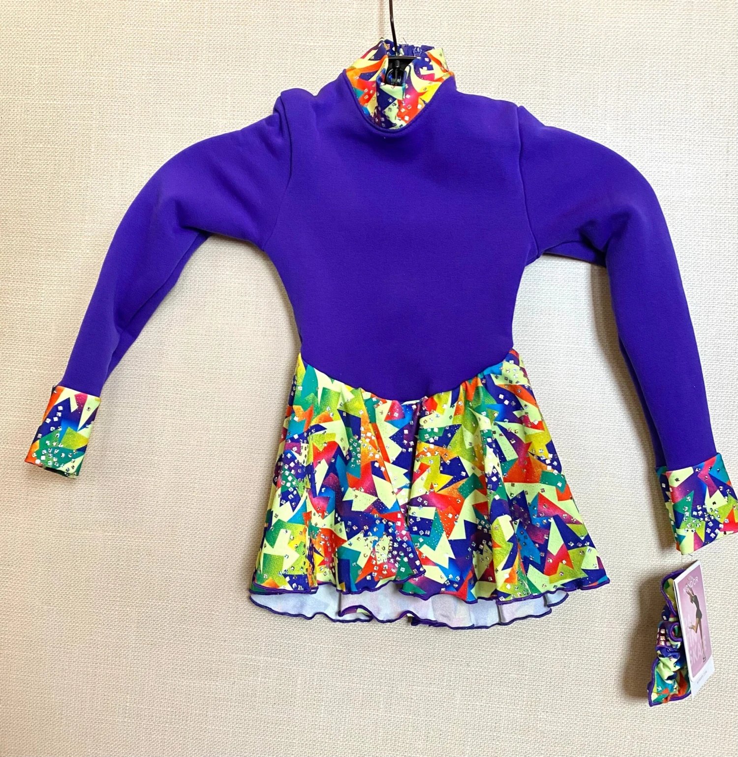 Polartec® long sleeve dress, Solid color body, printed skirt, cuff and collar, zipper closing, Hair tie included