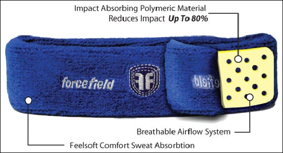 The ForceField FFTM Headband is lightweight, ventilated and adjustable with an impact absorbing polymeric layer that wraps around the head, offering increased protection at crucial impact zones where many head impacts occur. The product absorbs perspiration. If one side gets wet, you turn it inside out and use the other side.