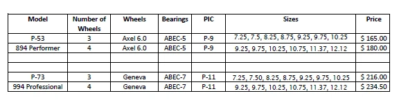 The 68mm “GENEVA” wheel was the result of extensive testing. The special single pour compound provides for enhanced edges, spins, and jumps.