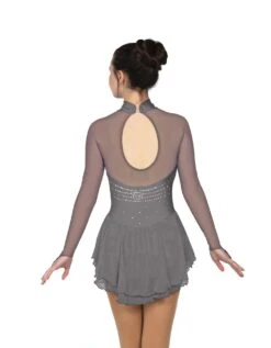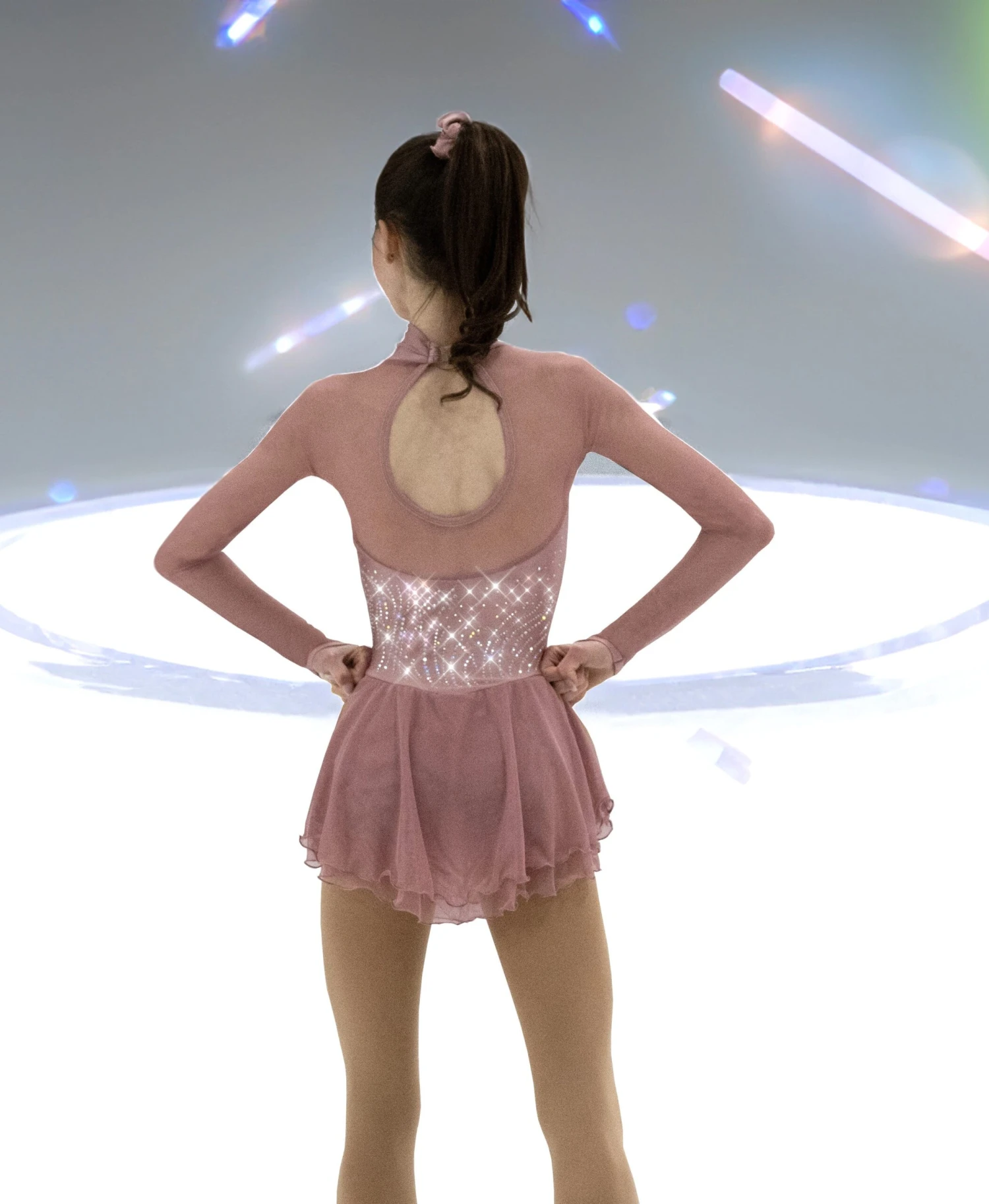 Lycra bodice skating dress, double mesh skirt and long sleeves, high neck with back clip, finger points, lined.