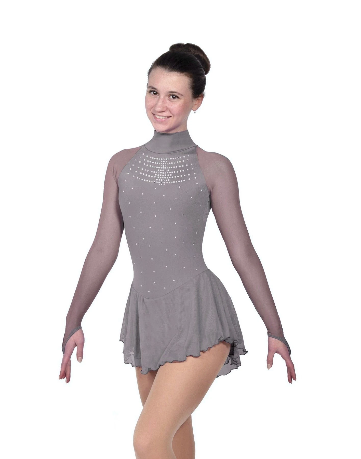 Beaded skating dress. Lycra bodice, double mesh skirt, long sleeves with finger points, high neck with back clip, lined. Beaded with clear crystalsÂ